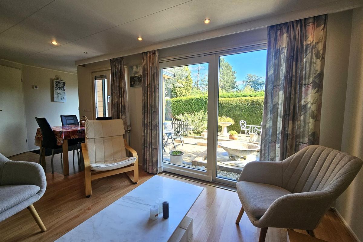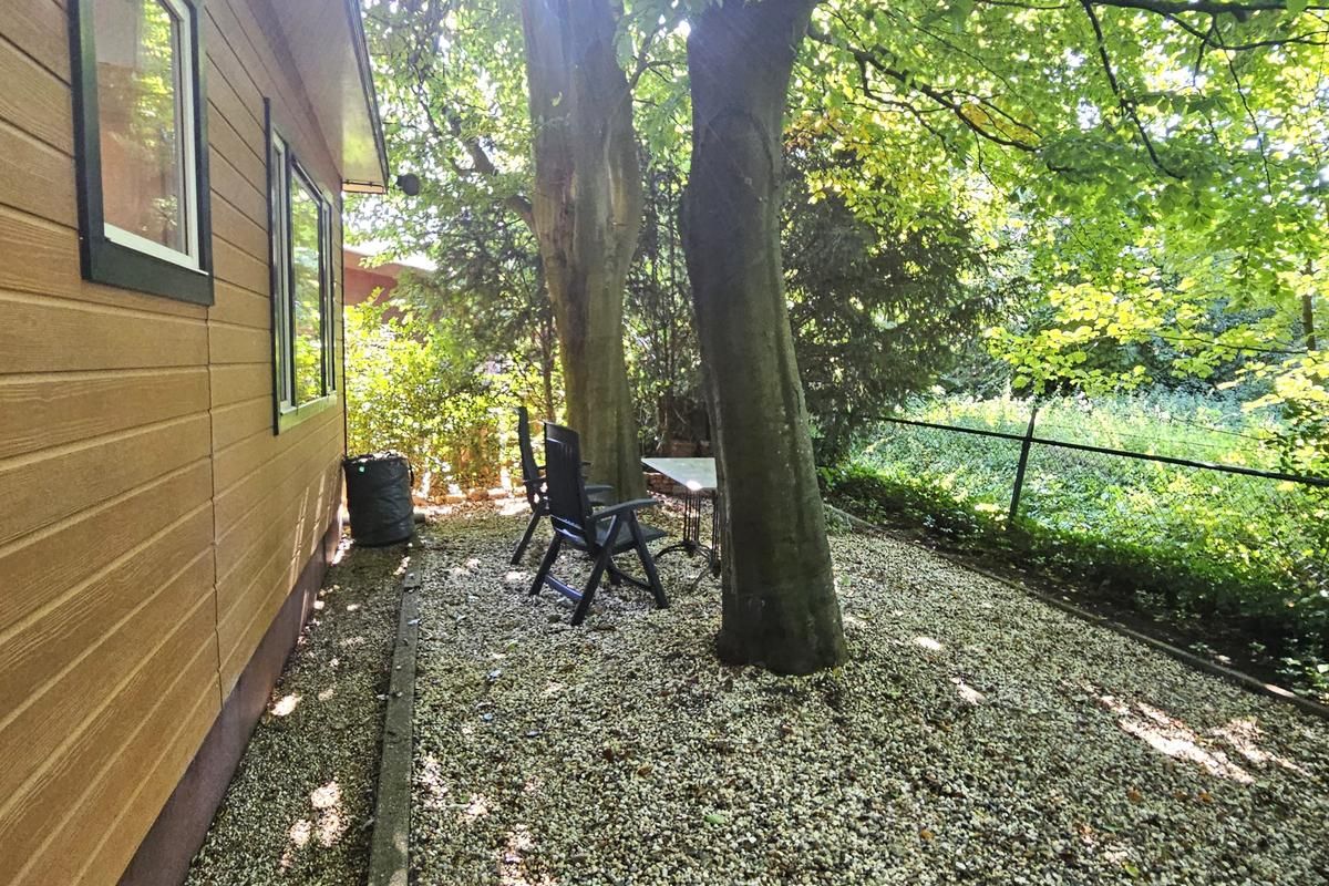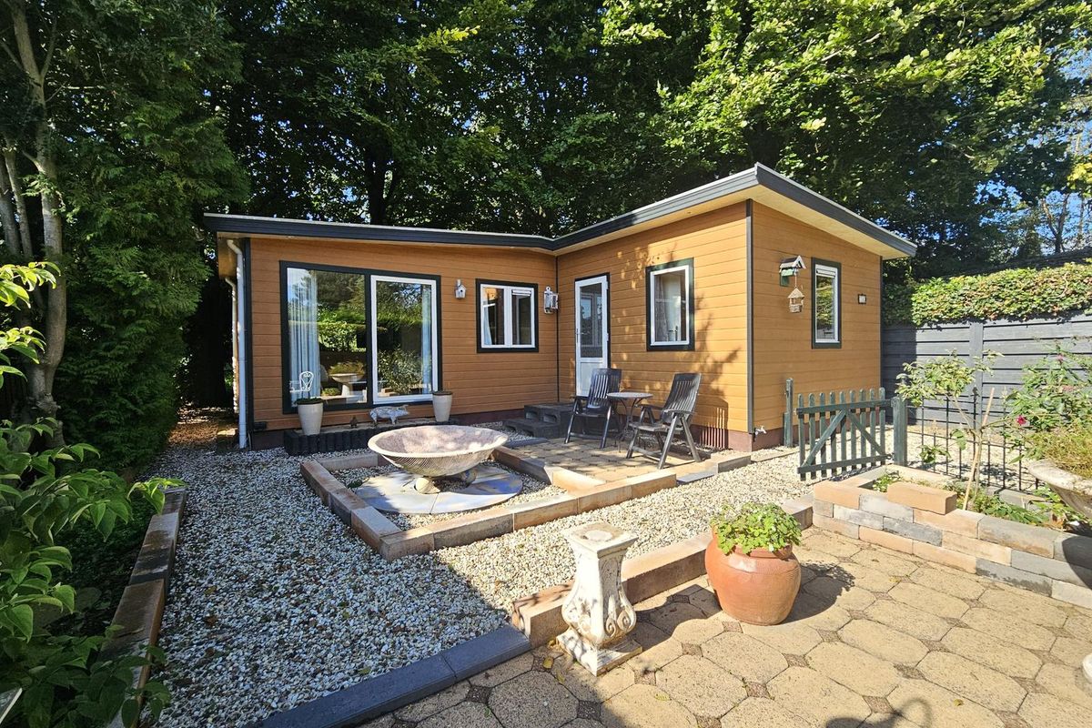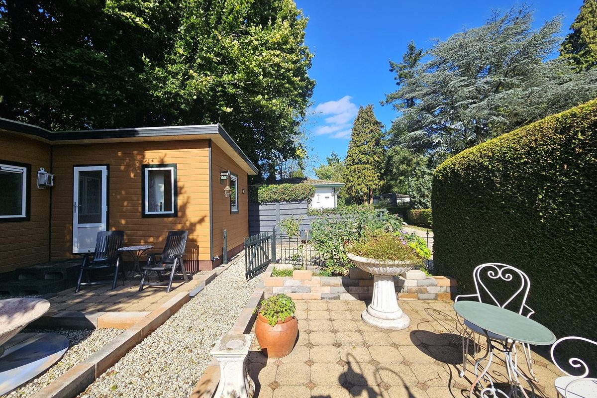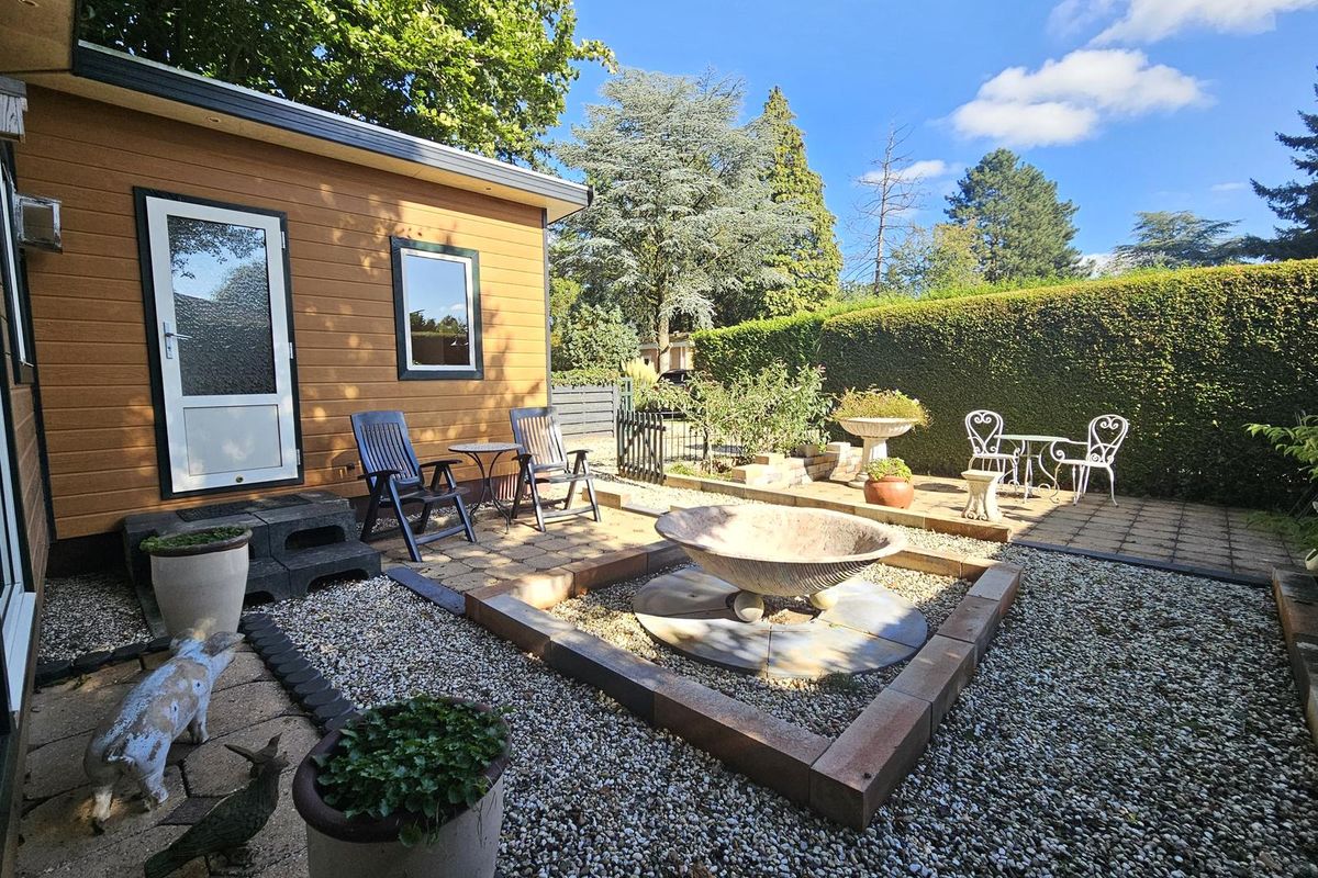 De tuin is een waar plaatje: goed onderhouden, smaakvol aangelegd en voorzien van diverse gezellige plekjes waar u zowel in de zon als in de schaduw kunt genieten. Achter de woning strekt zich een charmante, natuurlijke hoek uit aan de Hierdense Beek, omringd door volwassen bomen, waar u in alle rust kunt ontspannen en het prachtige uitzicht kunt bewonderen. Het geheel ademt een serene en uitnodigende sfeer, perfect om te genieten van buitenleven, lezen, of een kop koffie in de ochtendzon. Daarnaast beschikt het chalet over een eigen oprit, die parkeergelegenheid biedt, en een extra houten berging, ideaal voor het opbergen van tuinmaterialen, fietsen of andere spullen, waardoor functionaliteit en comfort hand in hand gaan.