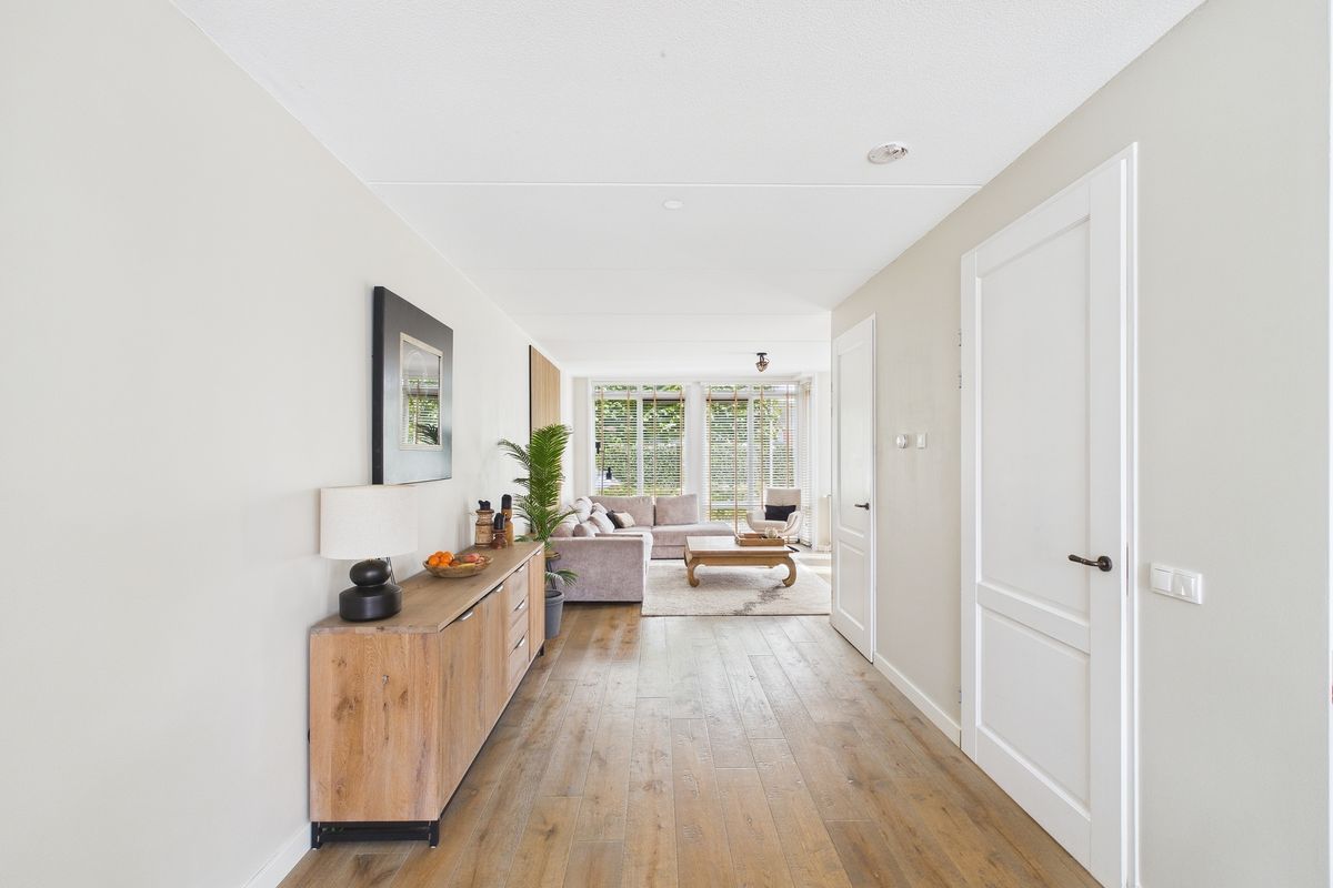 Ruime hal met garderobekasten, toilet en trapopgang. Een heerlijk lichte woonkamer met eiken parketvloer en gezellig zitgedeelte. De open keuken – compleet met inbouwapparatuur – staat door de openslaande deuren in direct contact met de tuin.