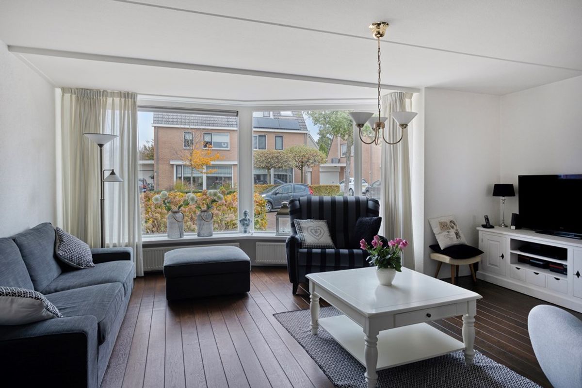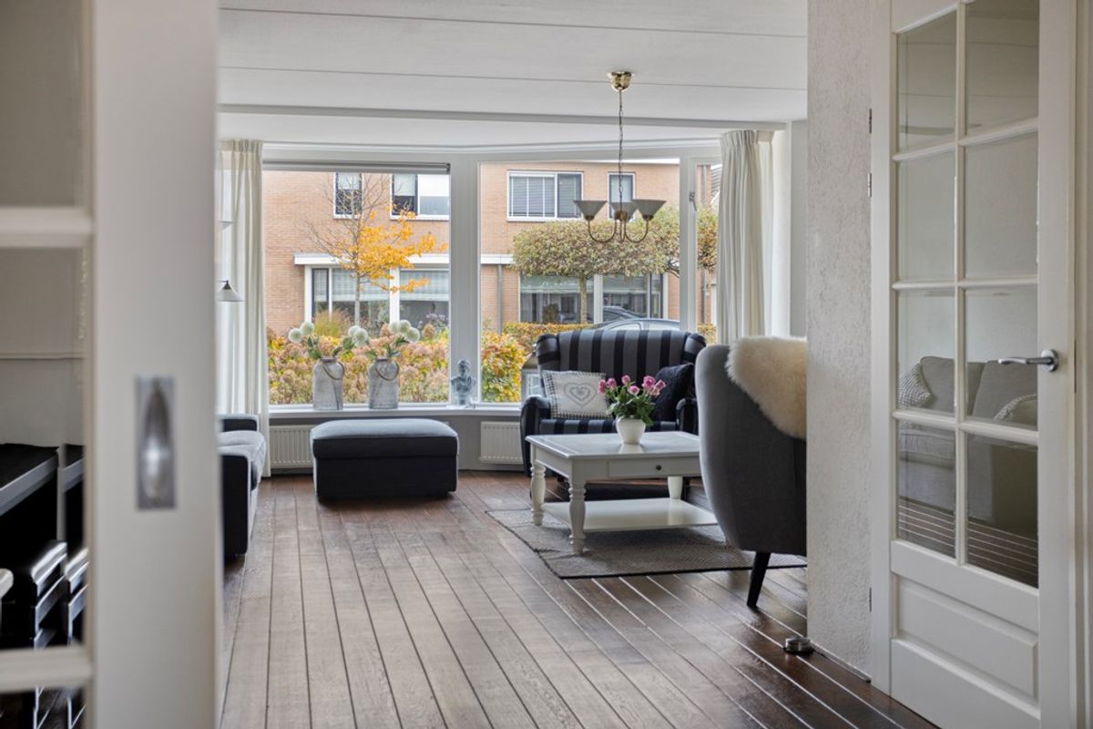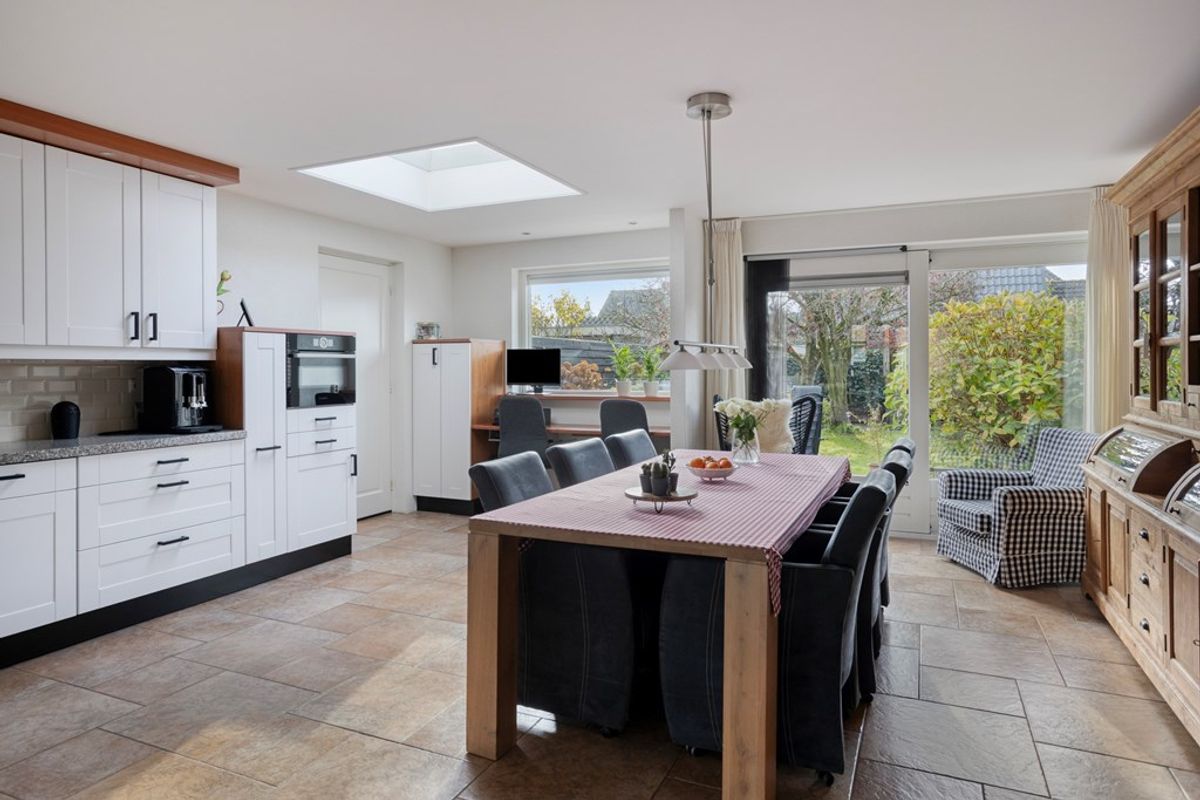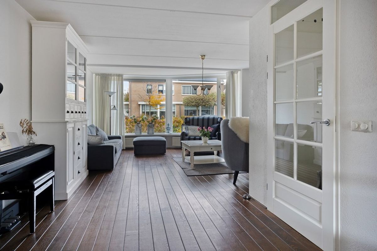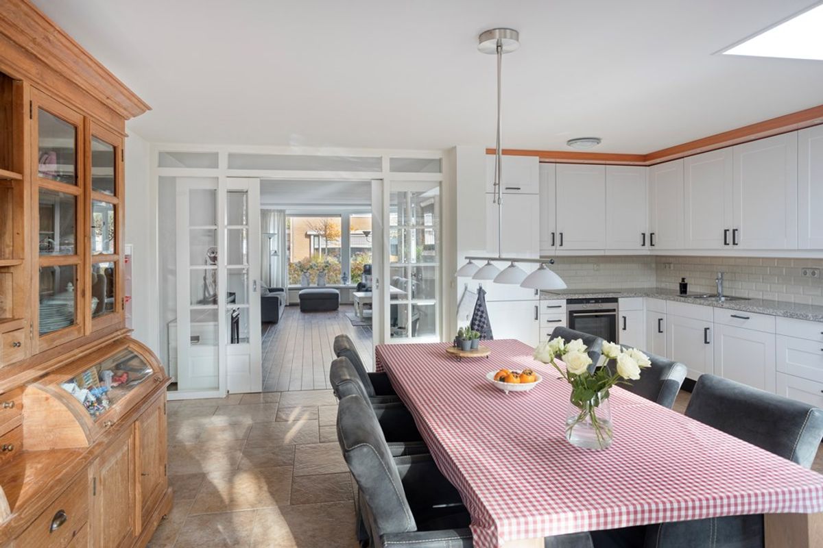 Via de verzorgde entree bereikt u de hal met toegang tot het moderne toilet, de trapopgang en de woonkamer. De living valt direct op door het brede erkerraam aan de voorzijde, dat het daglicht royaal binnenlaat en vrij zicht biedt op de straat. De houten vloer geeft het geheel een warme uitstraling, terwijl de opstelling ruimte biedt voor meerdere zithoeken. Centraal in de ruimte verbinden en suitedeuren de woonkamer met de leefkeuken, waar het leef- en kookgedeelte prachtig samenkomen. De keuken is uitgevoerd in een lichte kleurstelling met veel kastruimte, een granieten blad en apparatuur zoals een oven, combimagnetron, inductiekookplaat, vlakscherm afzuigkap, koel-/vriescombinatie en een vaatwasser. Het ruime eetgedeelte biedt plek voor een lange tafel én er is een praktische werkhoek gecreëerd. Door de lichtkoepel en de grote schuifpui wordt de keuken rijkelijk gevuld met daglicht. Aangrenzend bereikt u een tussenhal waar vaste kastruimte is gerealiseerd en u directe toegang heeft tot de garage en de achtertuin.
