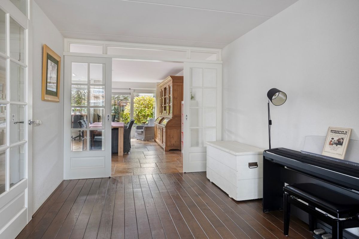 De achtertuin is een van de sterke punten van deze woning: breed, diep, groen en met verschillende zithoeken die elk seizoen een eigen sfeer geven. Het terras direct achter de woning is perfect voor lange zomeravonden, terwijl het tweede terras aan de zijkant een fijne beschutte plek vormt. De tuin zelf is verzorgd aangelegd met een groot gazon, volwassen bomen en borders met kleurrijke beplanting. Achterin staat een houten berging voor fietsen en tuingereedschap. Kinderen hebben volop ruimte om te spelen. De voortuin en oprit bieden daarnaast parkeerplek voor meerdere auto’s en directe toegang tot de garage.
