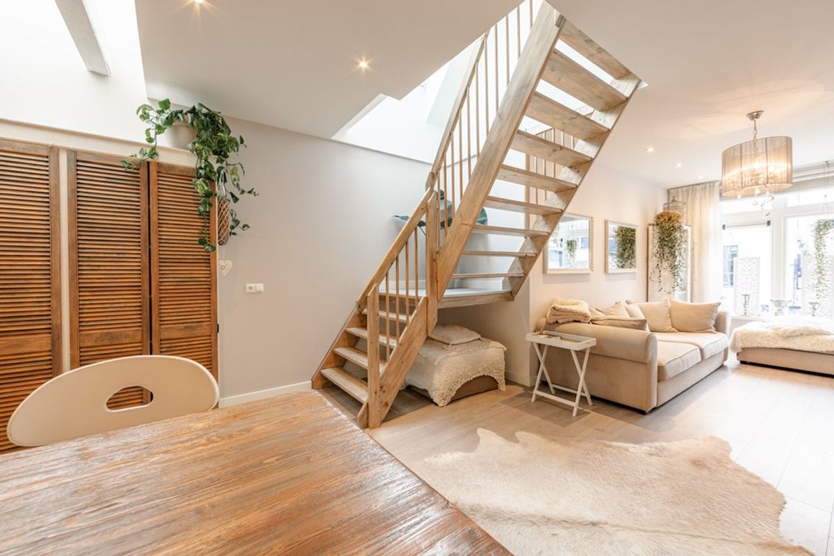 De mooie bordestrap biedt toegang tot de verdieping. Hier zijn nog twee slaapkamers en een tweede badkamer met een douche, toilet en wastafelmeubel.