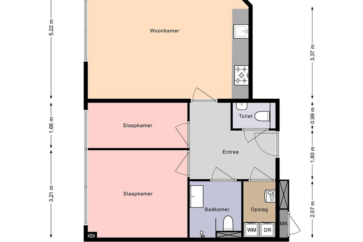 Op de begane grond is de entree van het appartement. Hier treft u een ruime hal met toegang tot de technische ruimte/ bergkast met CV, MV unit en aansluiting voor de wascombinatie. Daartegenover het separate toilet is voorzien van een zwevend toilet met fonteintje. Vanuit de hal komt u bij de twee ruime slaapkamers welke in grote variëren. De complete badkamer is voorzien van een chique betegeling, een wastafel met meubel, het tweede zwevend toilet, designradiator en een inloopdouche. De riante woonkamer met open keuken in rechte opstelling, is o.a. voorzien van voldoende bergruimte, 4-pits gaskookplaat met brede afzuigkap, vaatwasser, combi magnetron en een koelkast. Het gehele appartement is voorzien van een fraaie laminaatvloer met hoge plint.