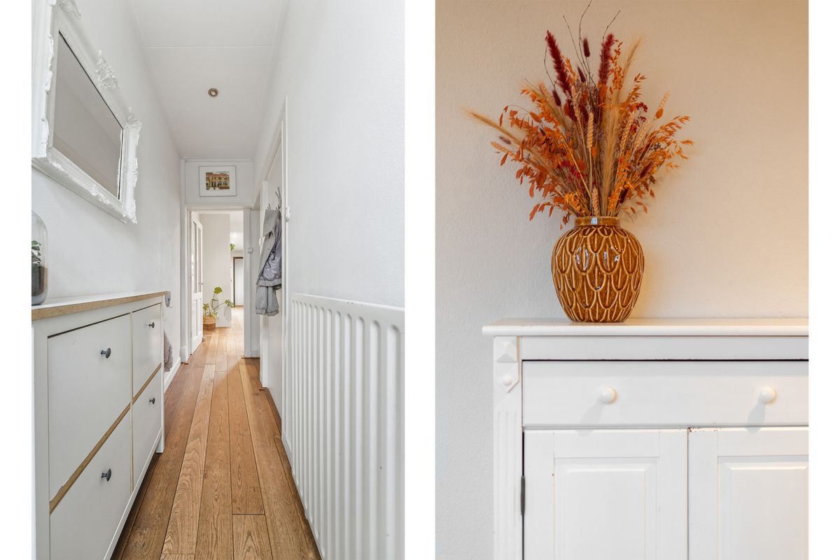 Entree: De lange en smalle hal vormt de toegang tot de woning en geeft verbinding met de woonkamer, meterkast en trap naar de eerste verdieping. De afwerking bestaat uit een houten vloer, structuurwanden en een gipsplafond.
