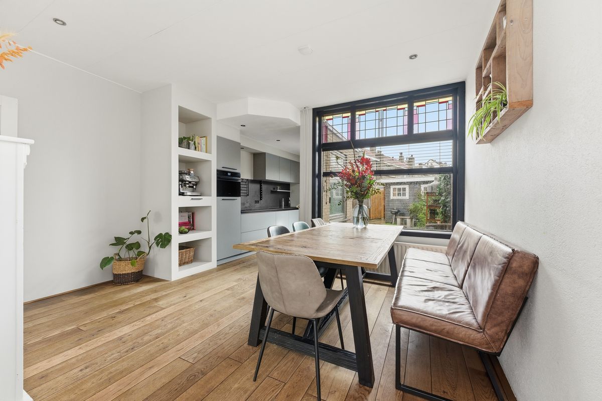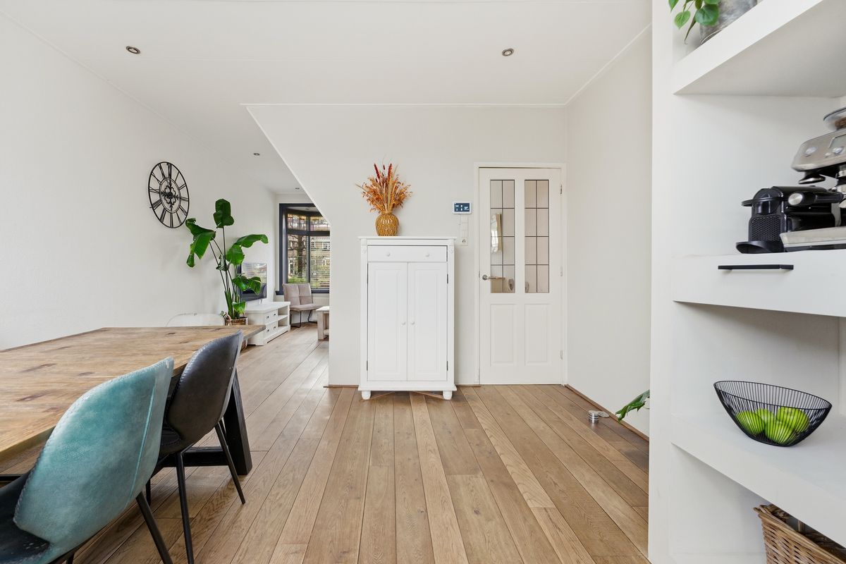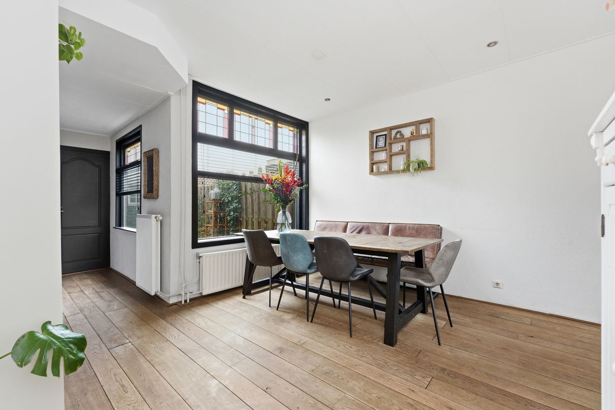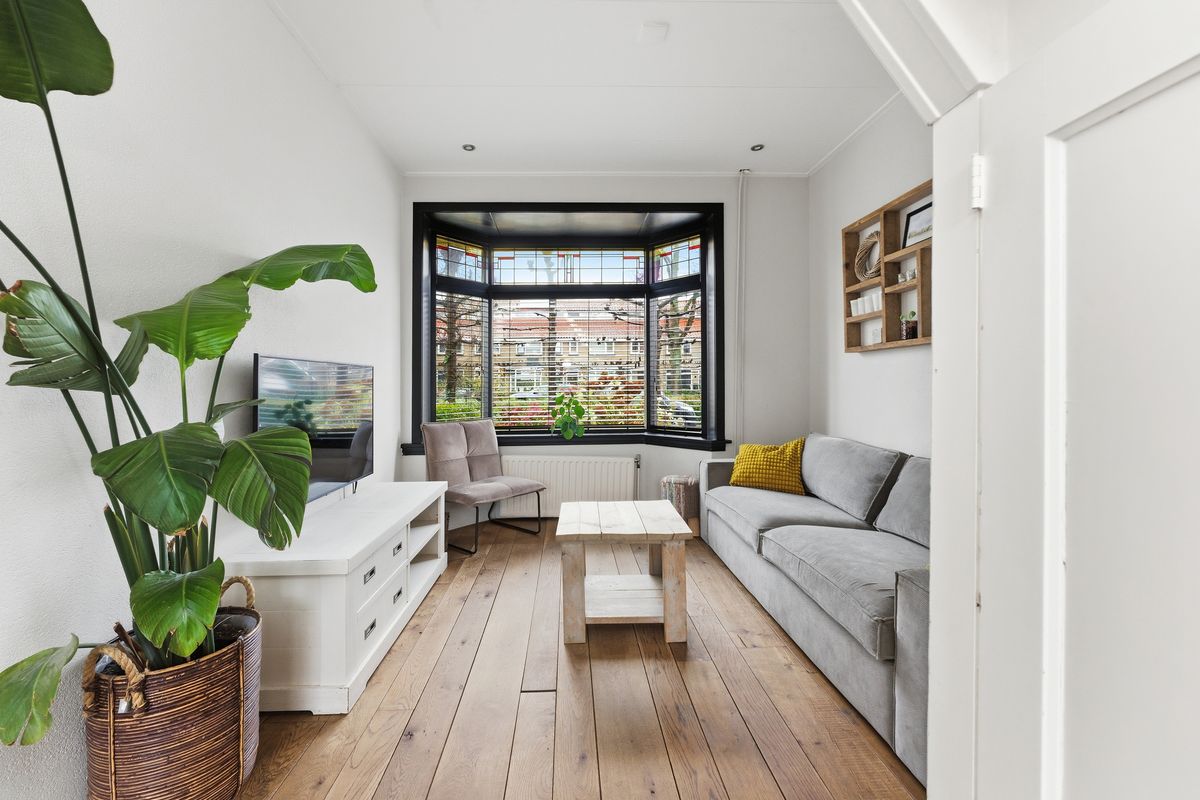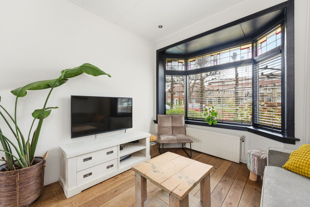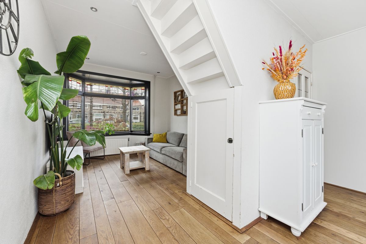 Woonkamer: De doorzonwoonkamer heeft aan de voorzijde een erker met glas-in-lood die direct voor sfeer zorgt. De trap is zichtbaar in de kamer en biedt daaronder extra opbergruimte. De indeling maakt het mogelijk om aan beide zijden een fijne zithoek en eethoek te creëren. De ruimte loopt door naar de open keuken aan de achterzijde. De woonkamer is afgewerkt met een houten vloer, gestuukte en spachtelputzwanden en een gipsplafond.