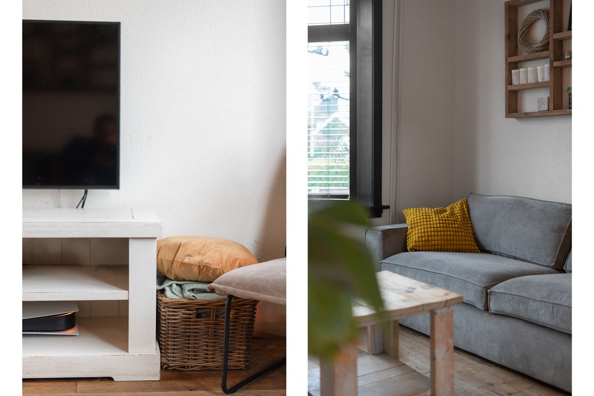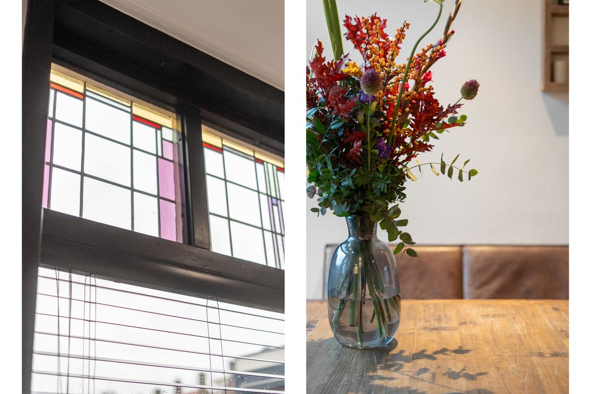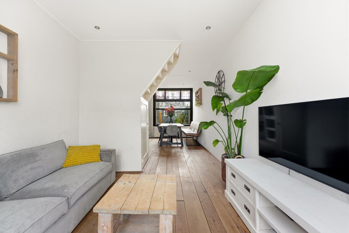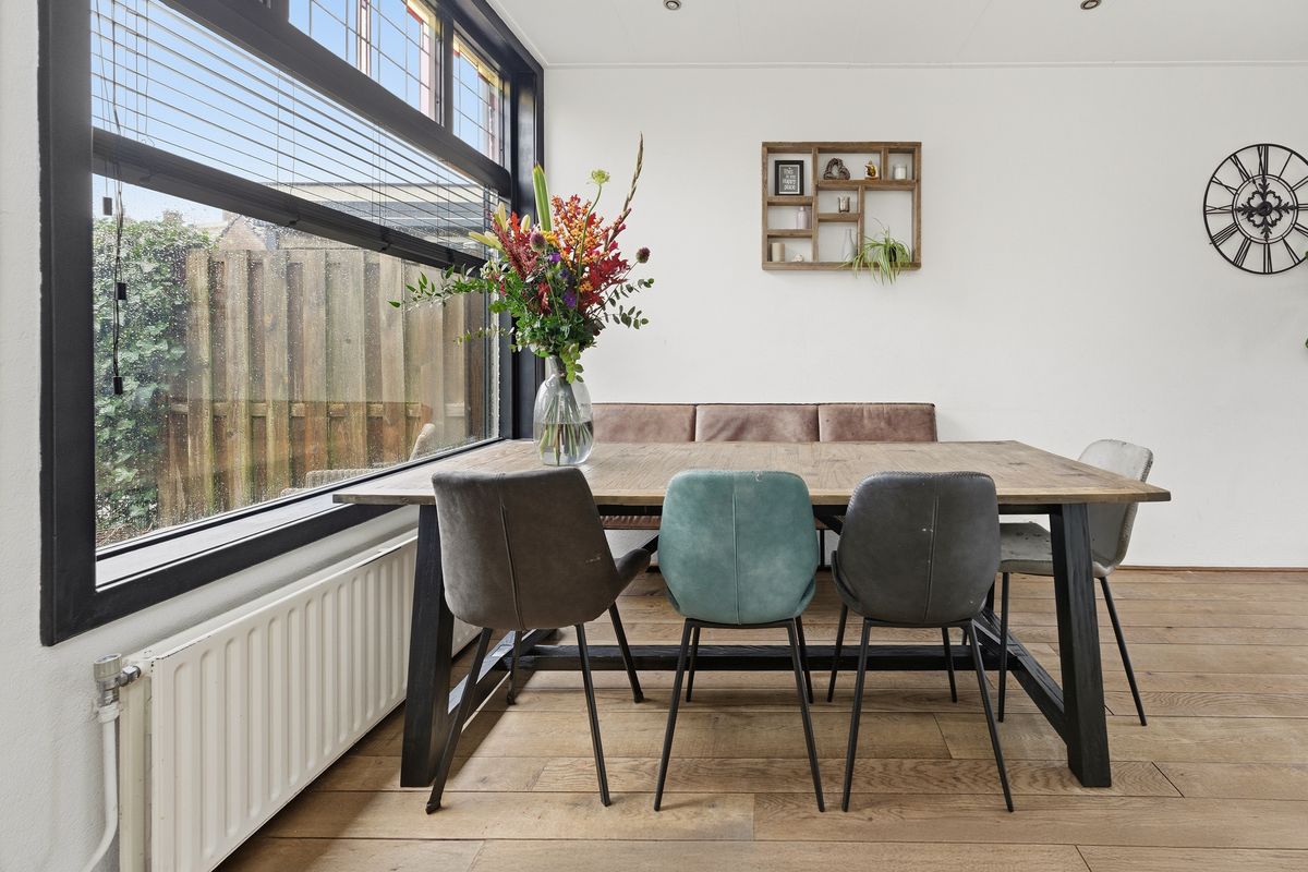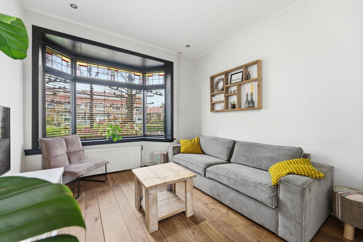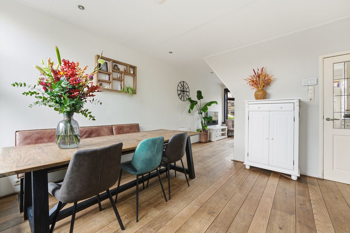 Woonkamer: De doorzonwoonkamer heeft aan de voorzijde een erker met glas-in-lood die direct voor sfeer zorgt. De trap is zichtbaar in de kamer en biedt daaronder extra opbergruimte. De indeling maakt het mogelijk om aan beide zijden een fijne zithoek en eethoek te creëren. De ruimte loopt door naar de open keuken aan de achterzijde. De woonkamer is afgewerkt met een houten vloer, gestuukte en spachtelputzwanden en een gipsplafond.