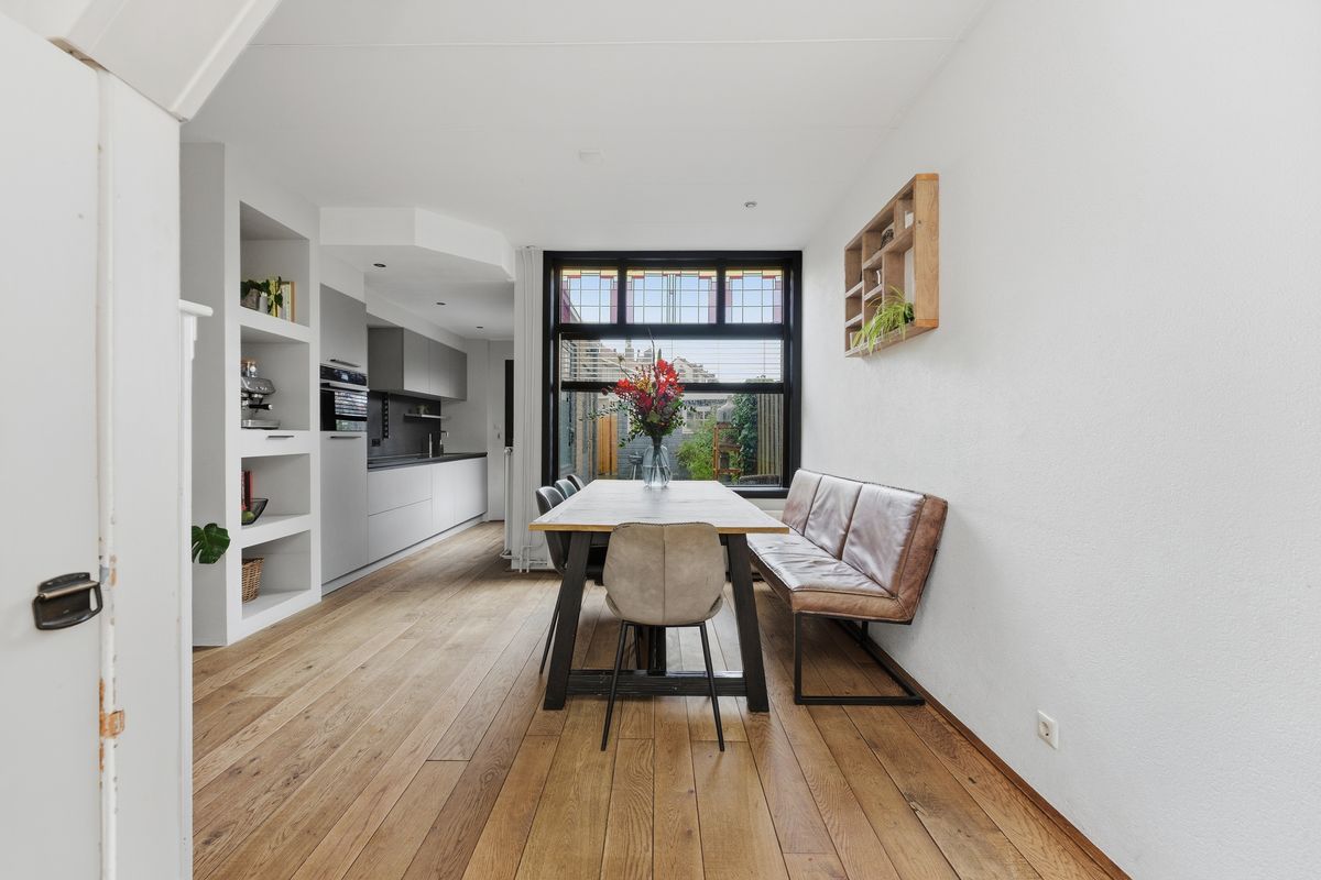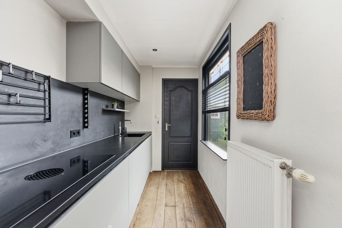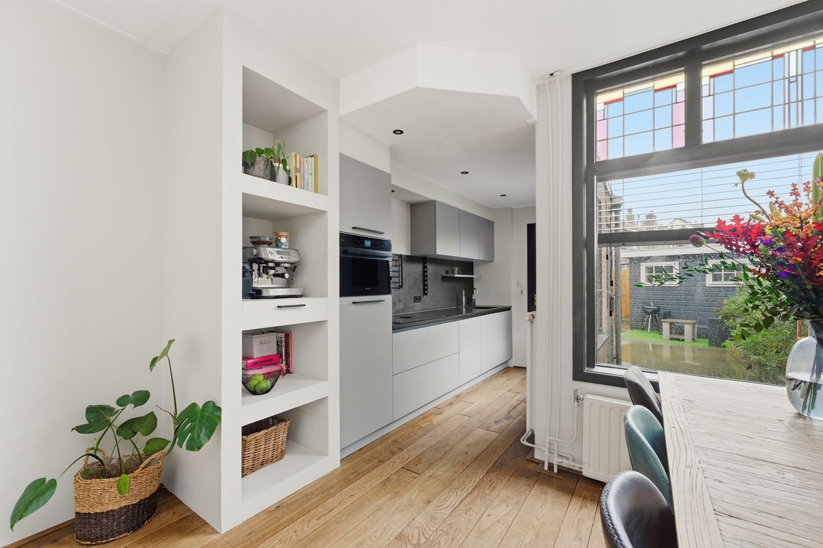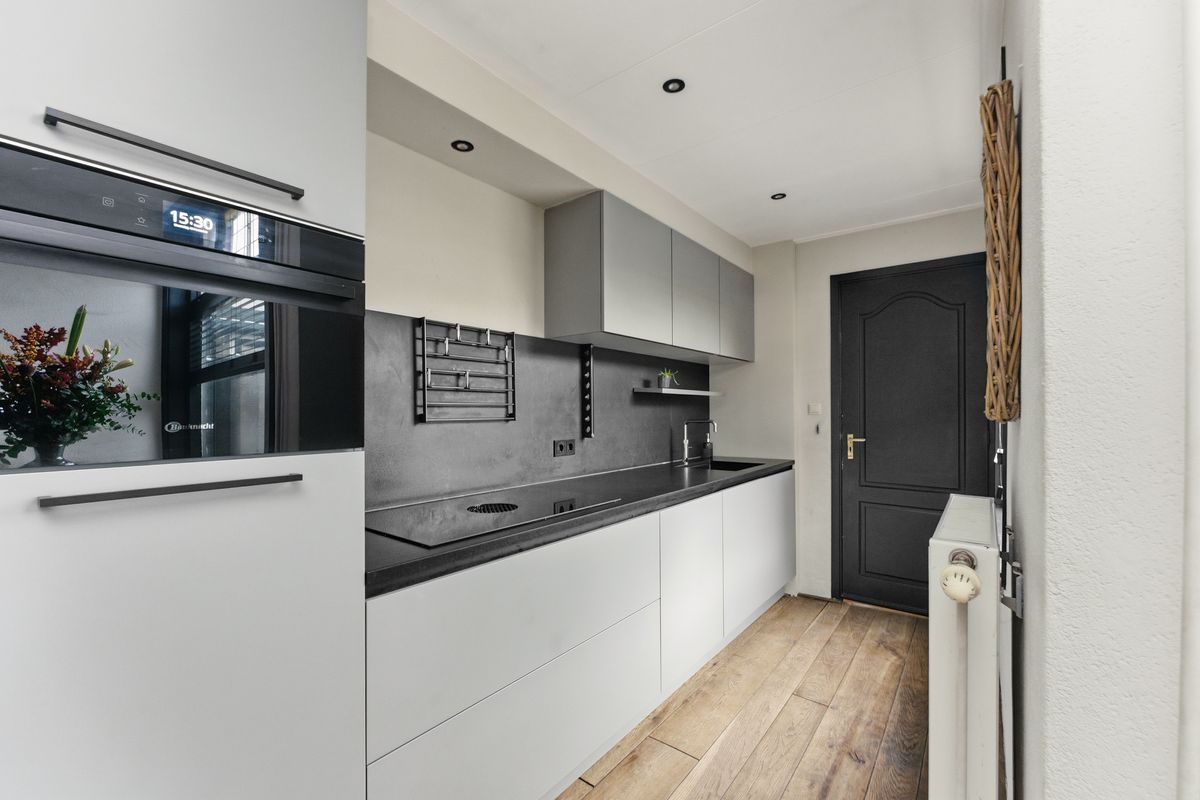 Keuken: De open keuken (2024) aan de achterzijde heeft een rechte opstelling en is uitgerust met een oven/magnetroncombinatie, inductiekookplaat, Bora-afzuiging, koelkast, Quooker en vaatwasser. Een glas-in-loodraam zorgt voor een mooi accent en een deur leidt naar het halletje richting de toiletruimte en achtertuin. De keuken vormt een praktische en overzichtelijke werkruimte en is strak afgewerkt in dezelfde stijl als de woonkamer.