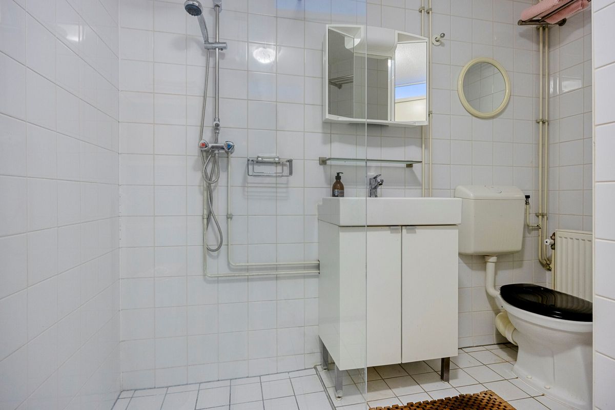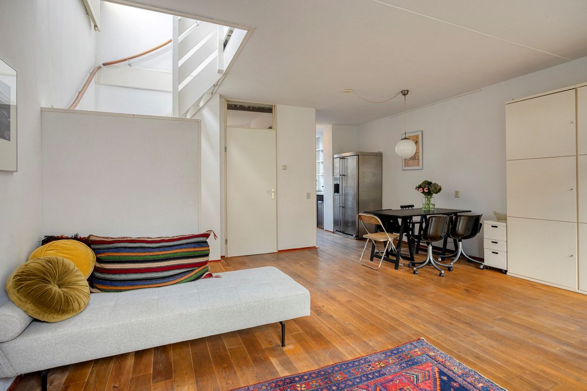 Op de eerste verdieping bevindt zich de entree van de woning. De ruime hal biedt toegang tot de meterkast, een separaat toilet met fontein en de lichte woonkamer. Grote ramen zorgen voor een prachtig uitzicht over de gracht en een overvloed aan daglicht. De woonkamer staat in open verbinding met de eetruimte, waardoor een ruimtelijk gevoel ontstaat. De halfopen keuken ligt aan de achterzijde en is praktisch ingericht. De trapopgang bevindt zich centraal in de ruimte, waardoor de verdieping op een speelse manier is ingedeeld.