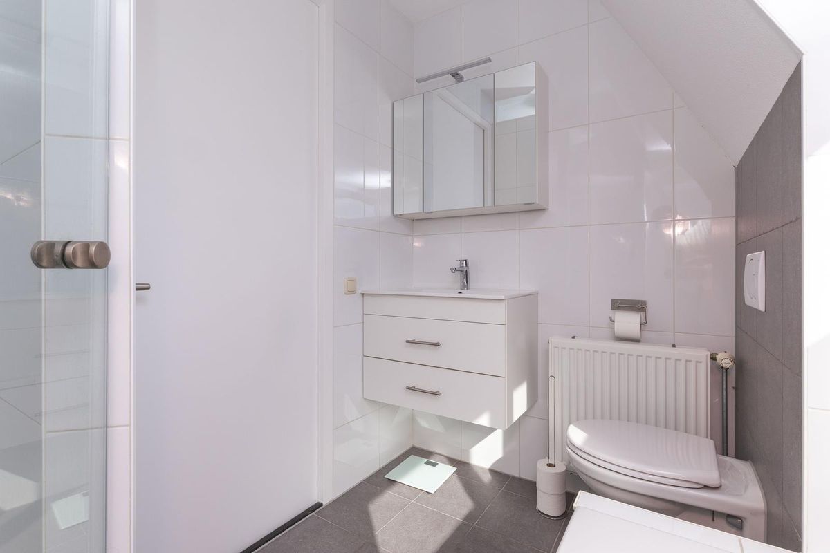 Ruime overloop met trap naar de 2e verdieping, toegang tot een ruime slaapkamer aan de voorzijde, badkamer met een hangcloset, wastafelmeubel, ligbad en een douchehoek, bergkast en een grote slaapkamer aan de achterzijde met een vaste kast en een inloopkast. Beide slaapkamers zijn erg ruim over de volledige breedte van de woning.