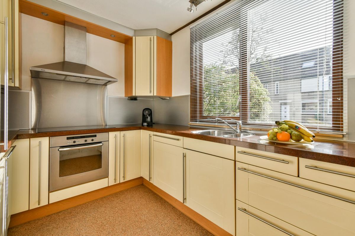 Voortuin met parkeerplaats op eigen terrein en toegang tot de berging en de woning. Entree/hal, meterkast, toilet v.v. duoblok en fonteintje, trapopgang en toegang tot de woonkamer. De woonkamer ligt aan de achterzijde en biedt een leuk uitzicht op de tuin. In de woonkamer en hal ligt een fraaie houten vloer. De open keuken bevindt zich aan de voorzijde en beschikt over een koel-vriescombinatie, een keramische kookplaat, een afzuigkap, een combi-oven en een vaatwasser. Door de U-opstelling is er veel werk- en bergruimte. De keuken is afgewerkt met een composiet aanrechtblad.