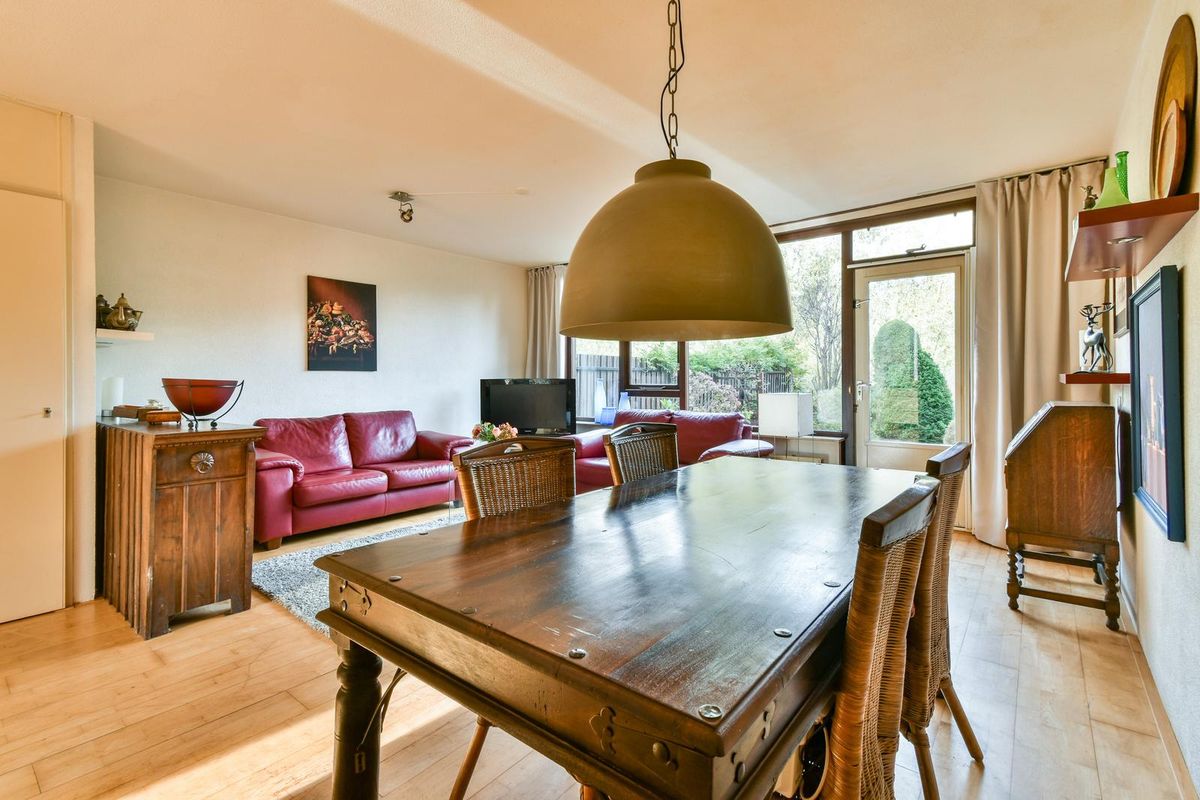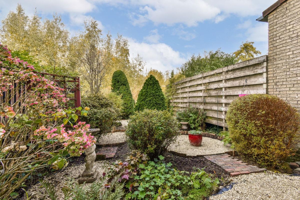 Vanuit de woonkamer is er toegang tot de achtertuin. De tuin is gelegen op het noordwesten, waardoor hier het avondzonnetje schijnt. De tuin is speels ingericht met siergrind, bestrating en veel vaste planten. Door het groen en water direct achter de tuin is er een groen, natuurlijk uitzicht.