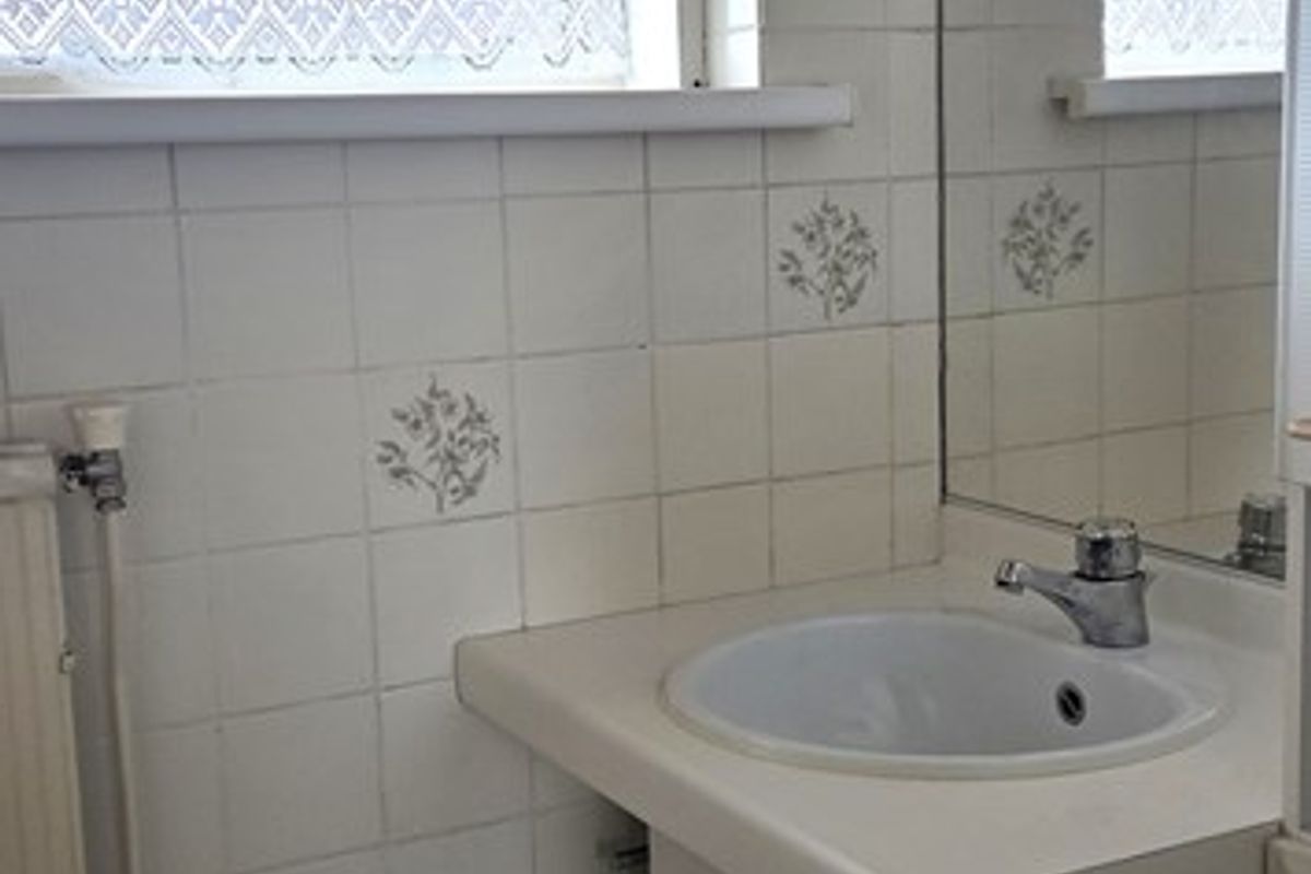 Ruime overloop, 3 slaapkamers en een nette badkamer met wastafel en douchehoek.