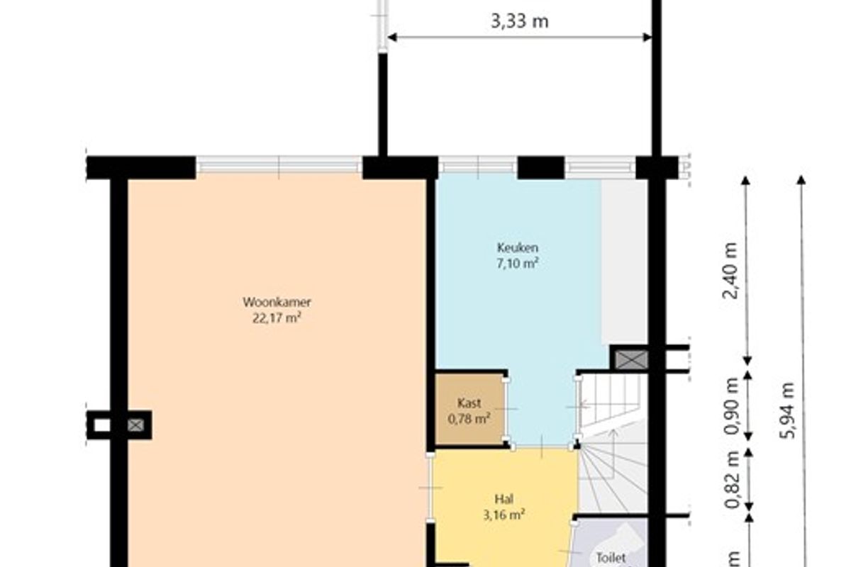 Via de hal met meterkast, toilet en trapopgang, ga je linksaf naar de lichte doorzon-woonkamer met open haard of rechtdoor naar de keuken. Via keuken kom je in de bijkeuken met achterentree en toegang tot de (fietsen)berging.