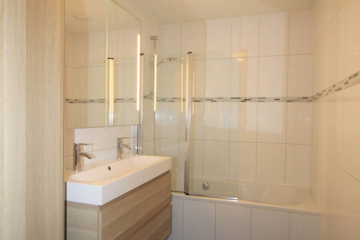 The neat bathroom is renovated and included a bathtub feautues a washbasin with mirror and towel radiator.