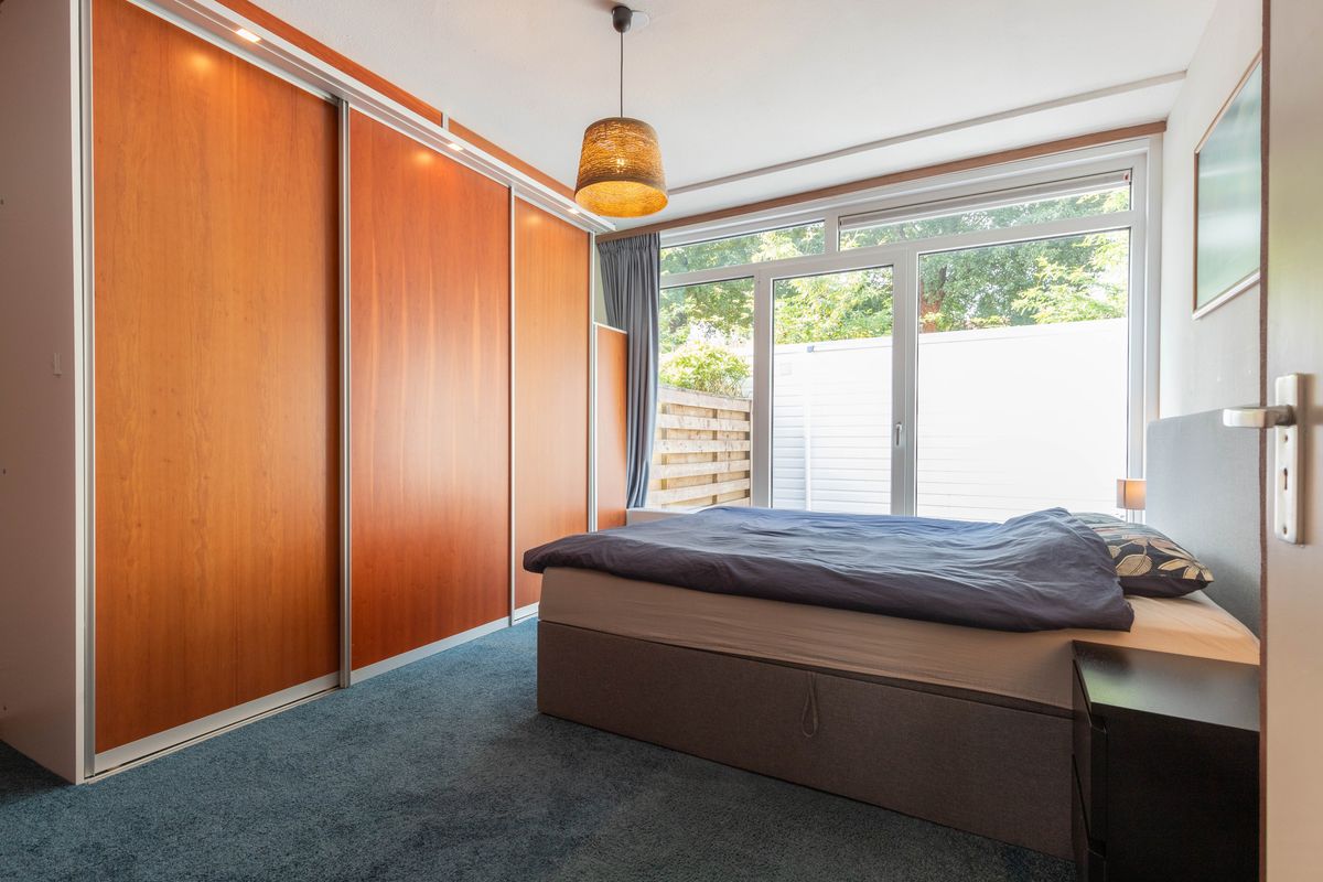 De twee slaapkamers zijn praktisch ingedeeld: De hoofdslaapkamer is heerlijk licht dankzij de grote raampartij en grenst direct aan de voortuin. De tweede, kleinere slaapkamer biedt eveneens toegang tot de voortuin en is ideaal te gebruiken als kinder- of werkkamer.
