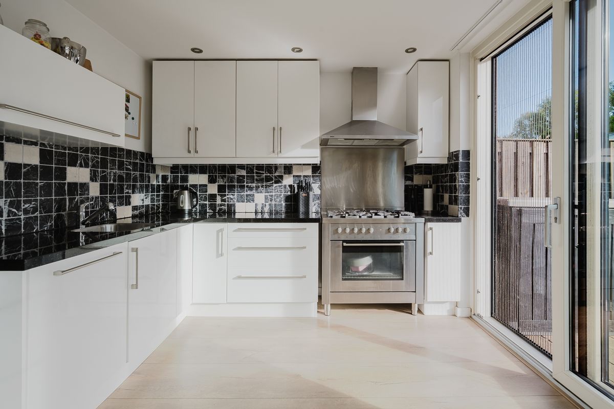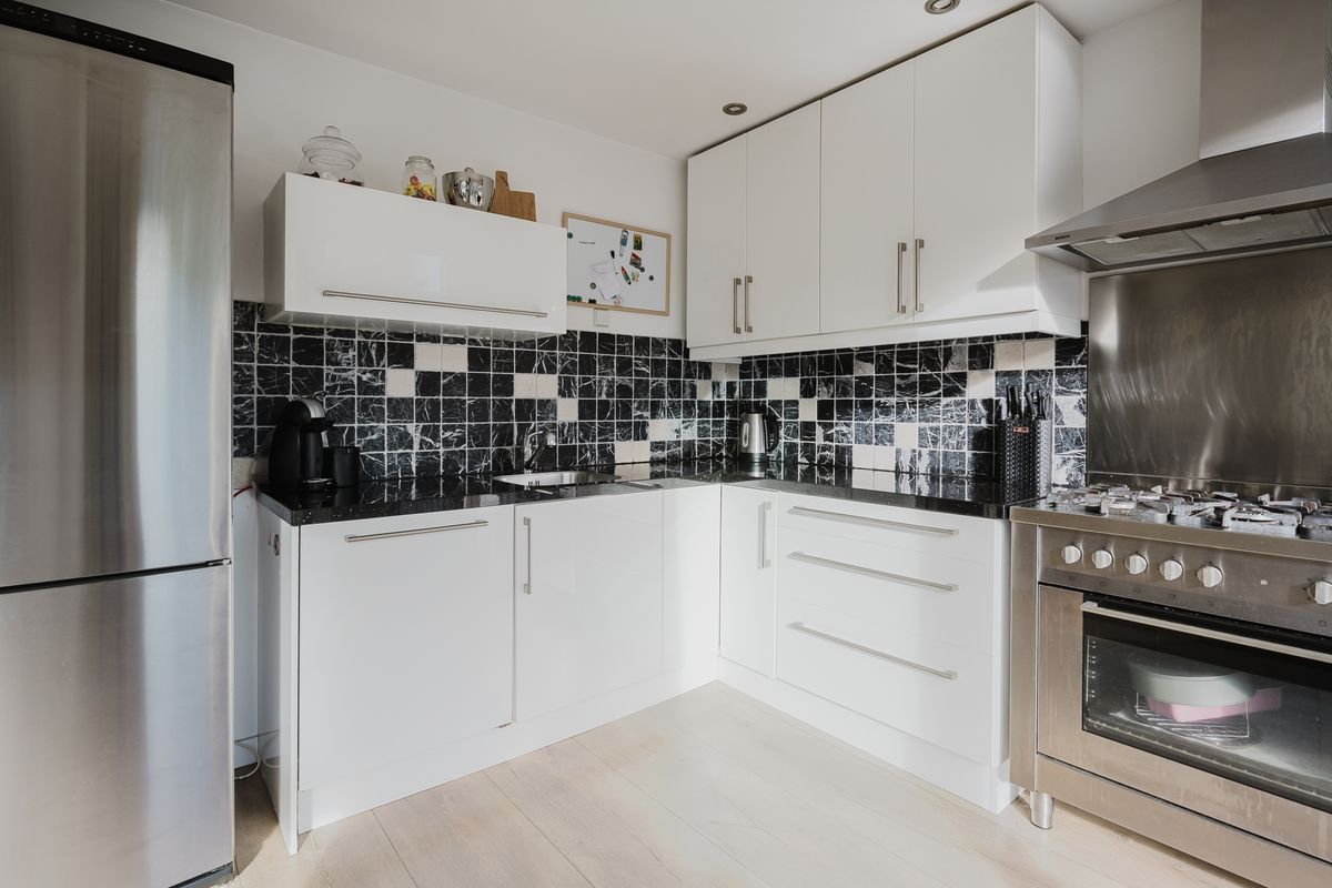 De open keuken bevindt zich aan de achterzijde en is uitgerust met een 5-pits kookplaat, oven, koel-vriescombinatie, vaatwasser en een close-in boiler. Via de schuifpui bereik je de onderhoudsvriendelijke achtertuin, volledig betegeld en voorzien van een elektrisch zonnescherm en achterom. Vanuit de tuin heb je toegang tot de stenen garage met elektrische garagedeur en de praktische berging.