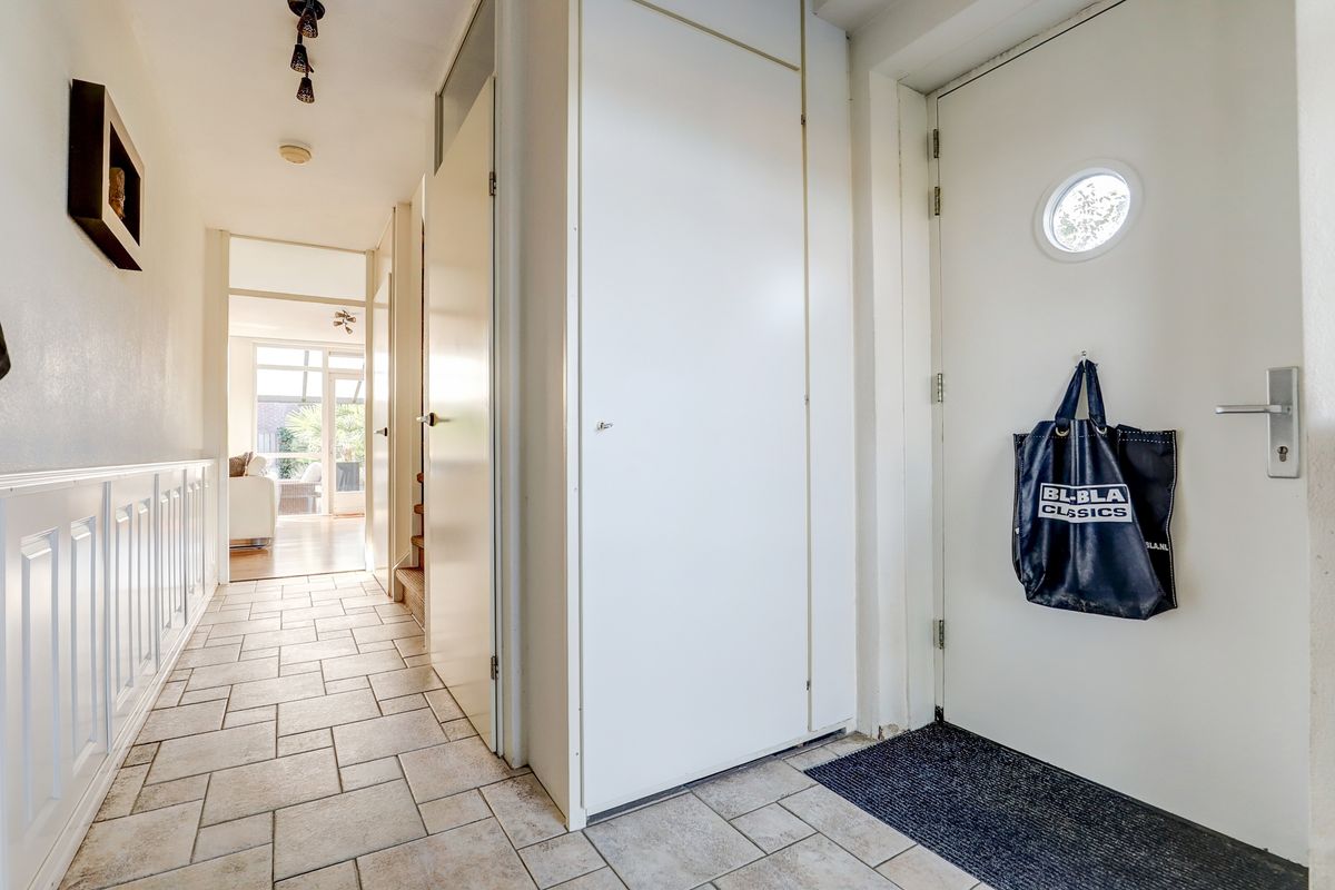 De voordeur bevindt zich in de met nieuwe trespa-beplating afgewerkte zijgevel. Je stapt een royale hal binnen met voldoende ruimte voor bijvoorbeeld een kinderwagen en garderobe. In de hal is ook het toilet met fonteintje, een trapkast en natuurlijk de trap naar boven.
