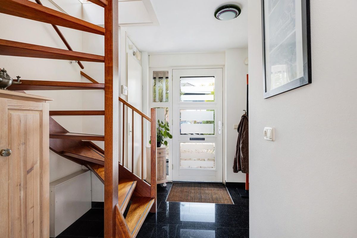 De royale voortuin biedt parkeergelegenheid op eigen terrein. Via de entree komt u in de ruime hal met trapopgang, modern toilet en toegang tot de inpandige, geïsoleerde garage – ideaal voor het stallen van fietsen, opslag of als hobbyruimte.