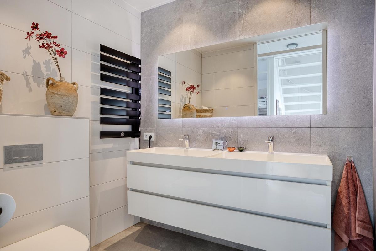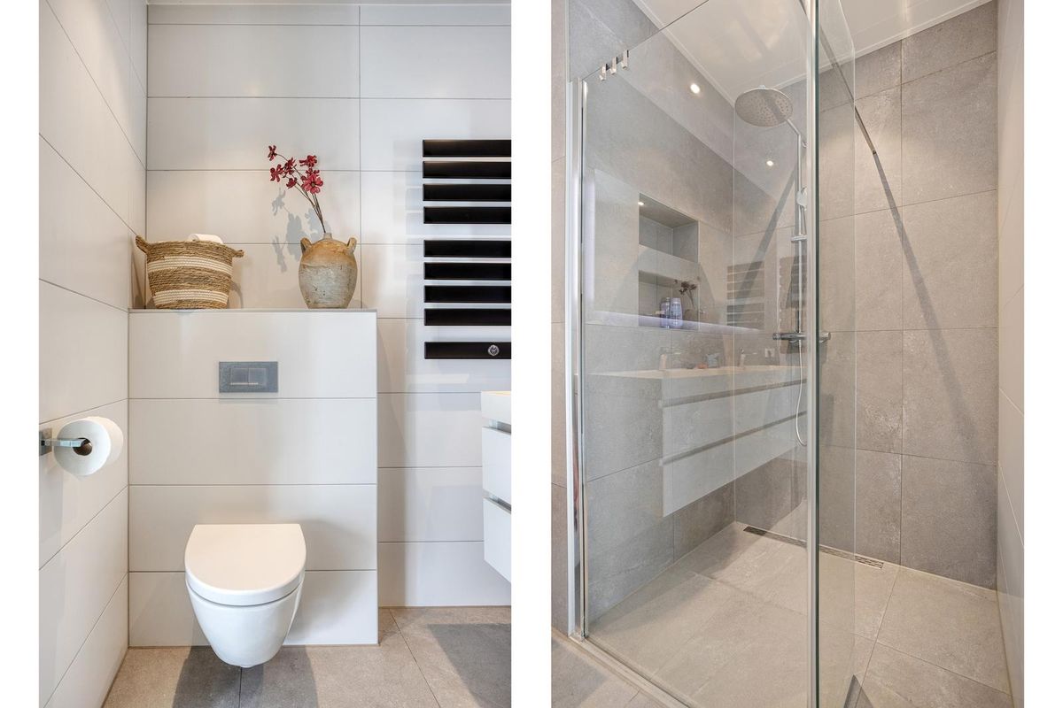 De moderne badkamer is geheel betegeld en uitgerust met een inloopdouche, dubbele wastafel, tweede toilet en designradiator. Aan de achterzijde bevinden zich twee extra slaapkamers, ideaal voor kinderen, logees of als werkruimte.