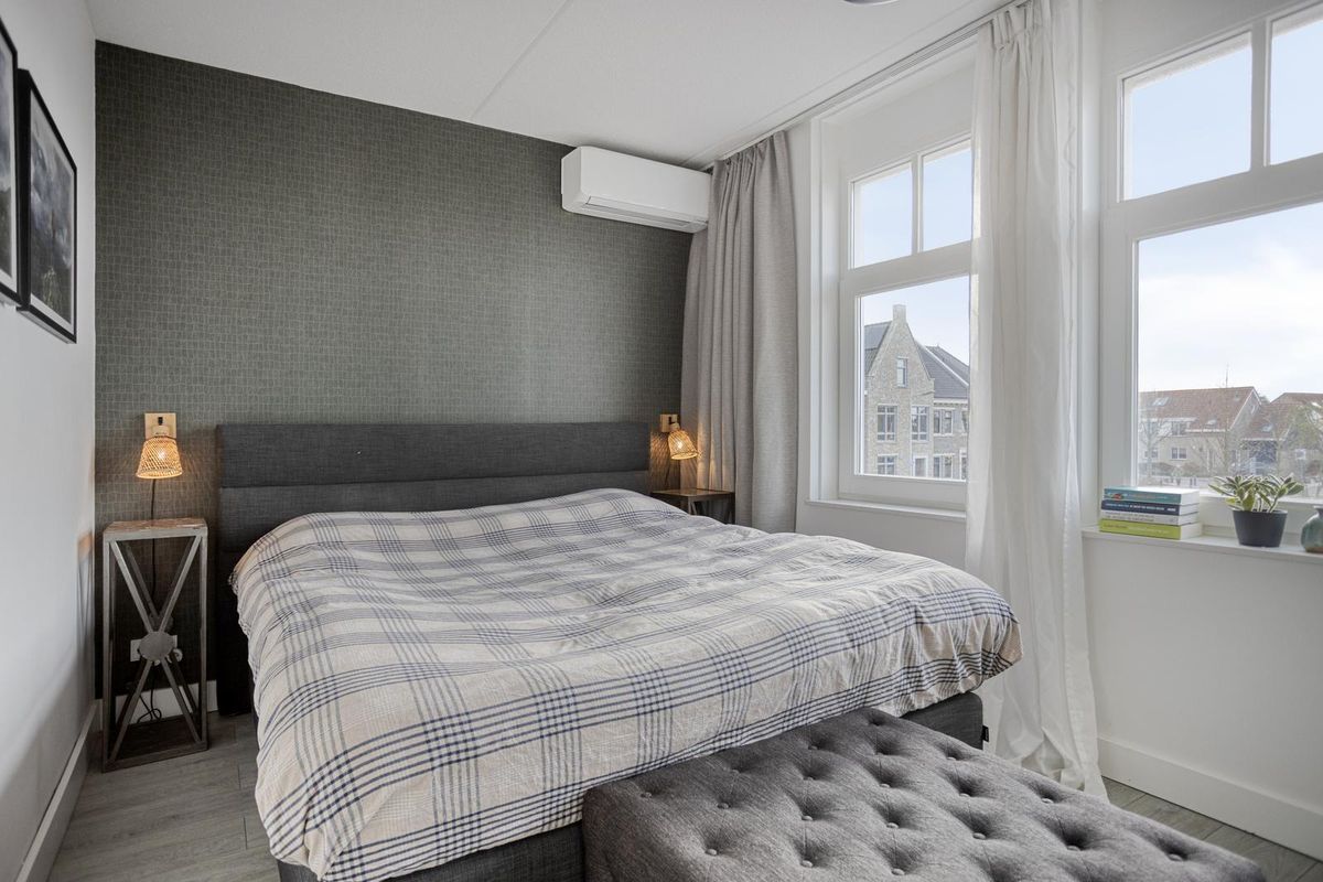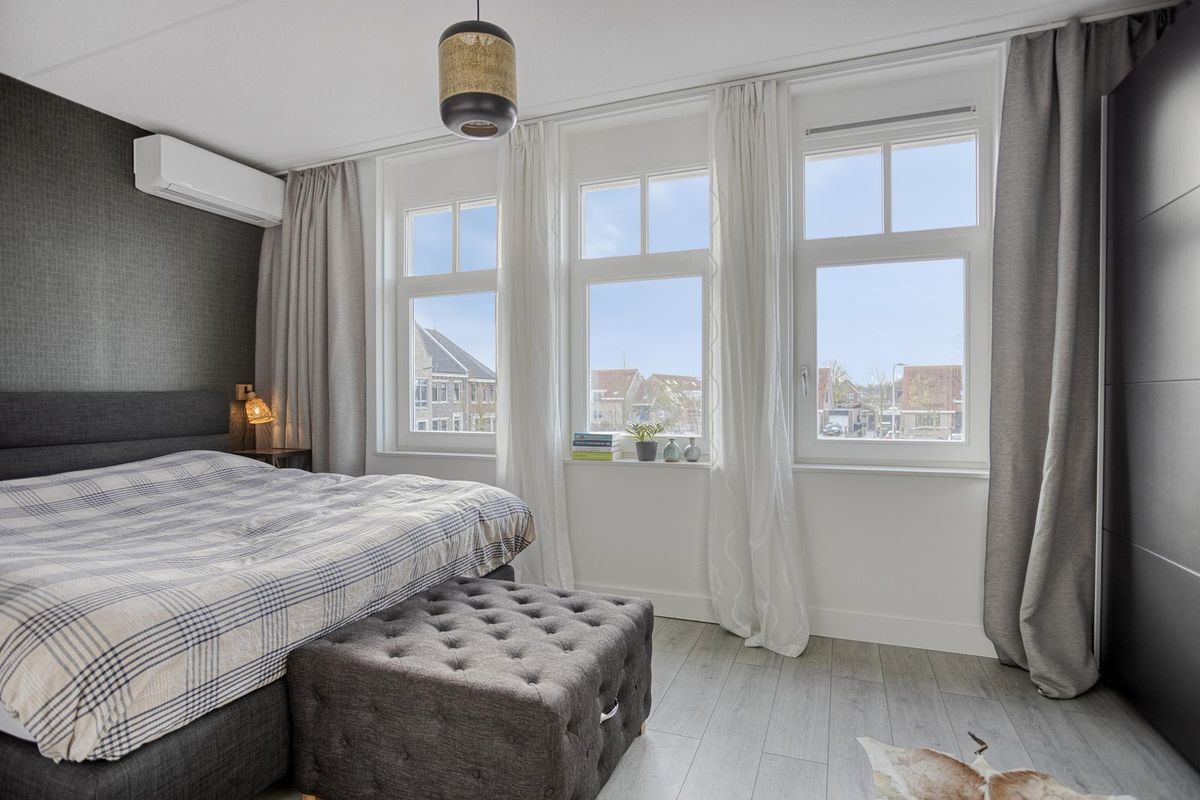 Via de overloop bereik je drie slaapkamers, waaronder een ruime hoofdslaapkamer over de volle breedte van de woning, voorzien van airconditioning (2024).