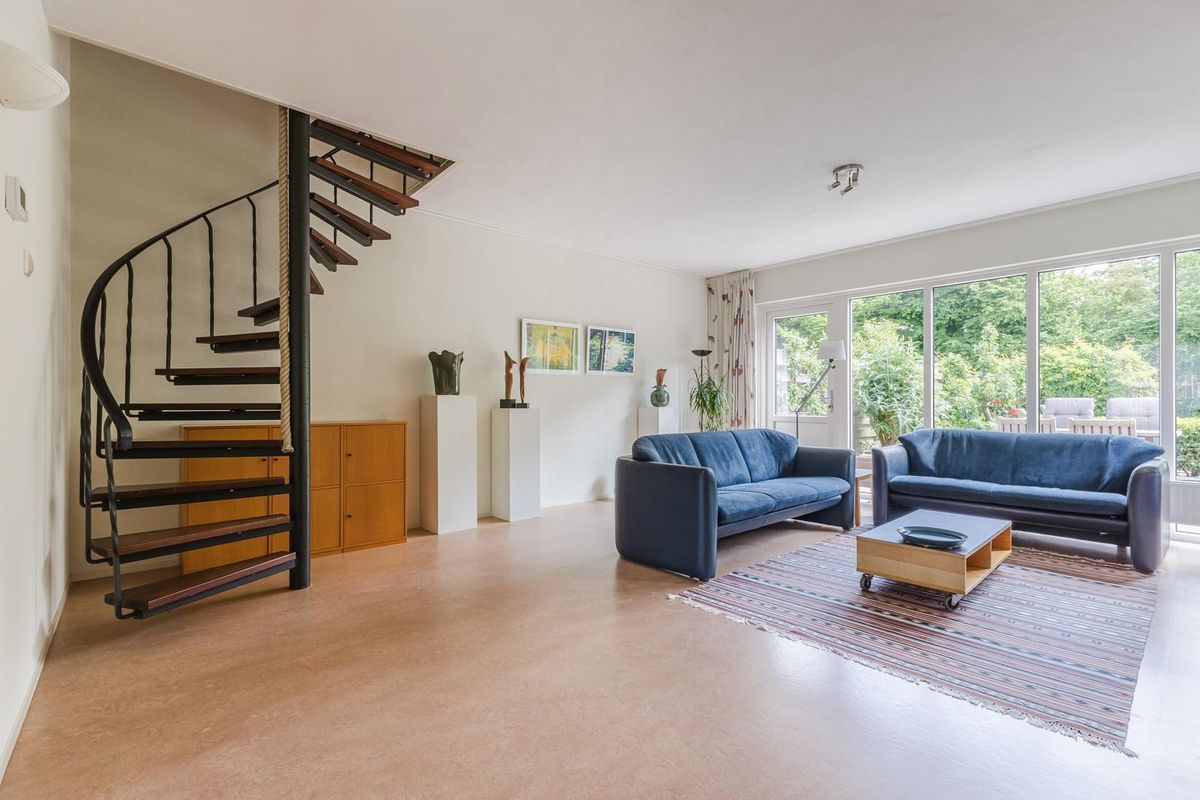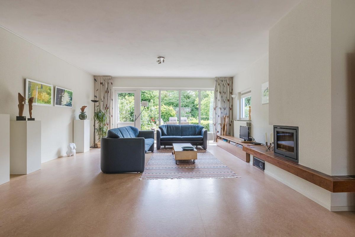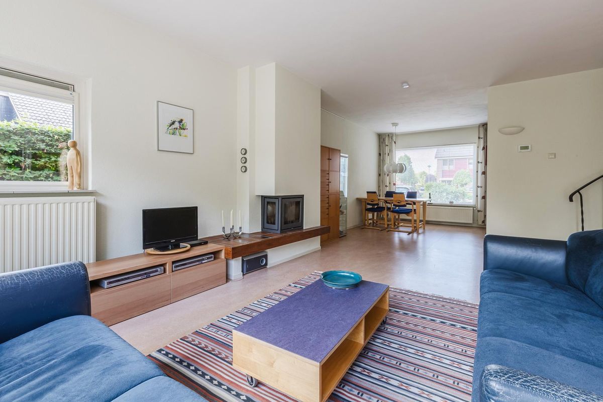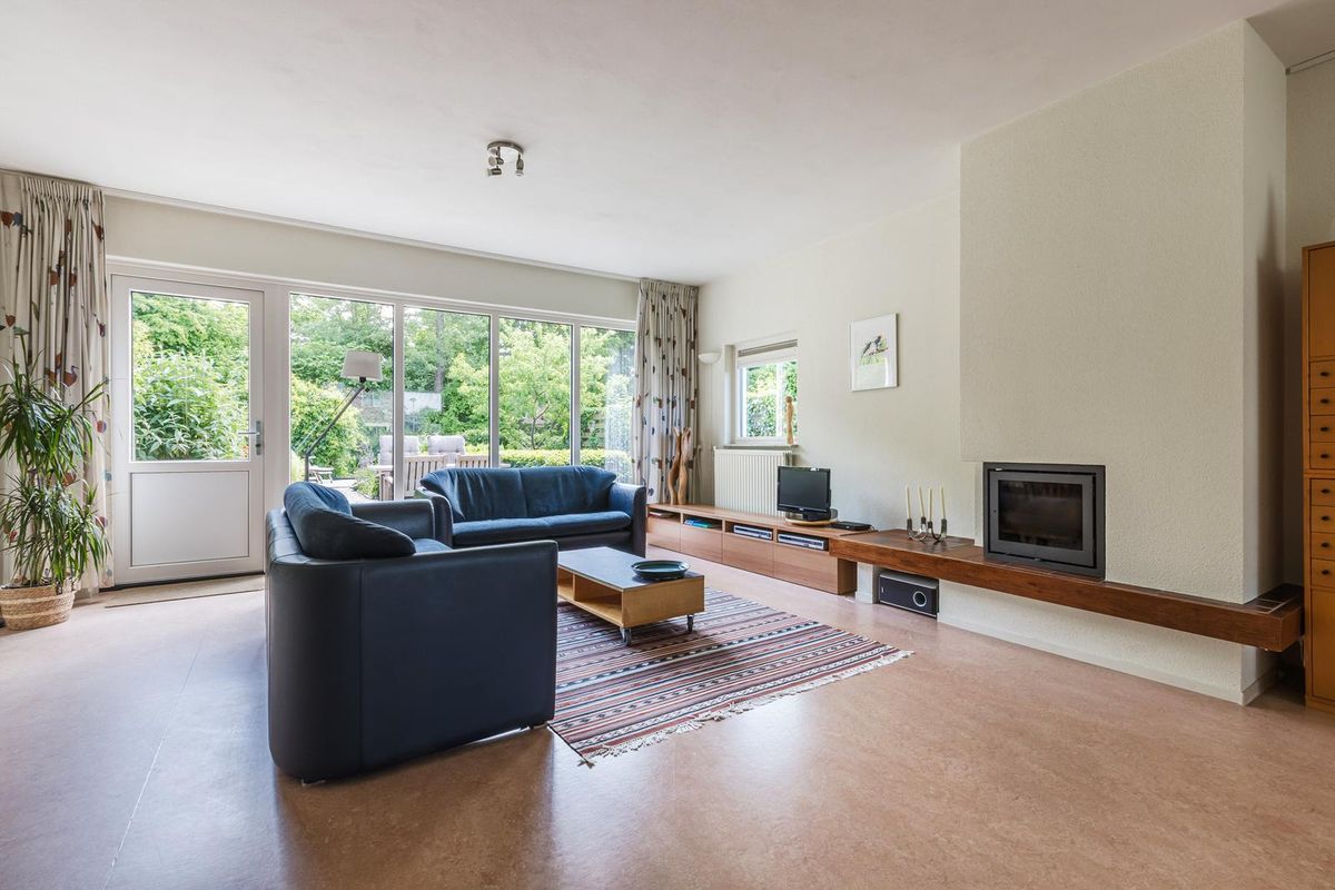 De lichte en ruime woonkamer heeft een fijne sfeer en is afgewerkt in rustige tinten. Dankzij de brede raampartijen aan zowel de voor- als achterzijde geniet je hier de hele dag van een prettige lichtinval en een mooi uitzicht op de tuin. De gezellige haard maakt het plaatje compleet. In de woonkamer bevindt zich ook de trap naar de eerste verdieping.