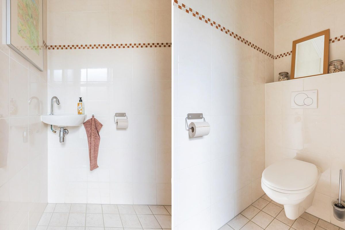 Via de sfeervolle voortuin bereik je de voordeur van deze verrassend ruime woning. De entreehal biedt toegang tot een praktische berging, een modern toilet met fonteintje en de keuken en de woonkamer.