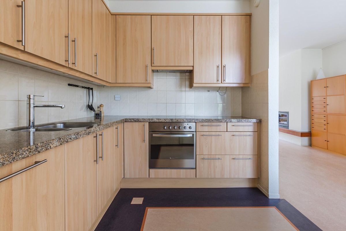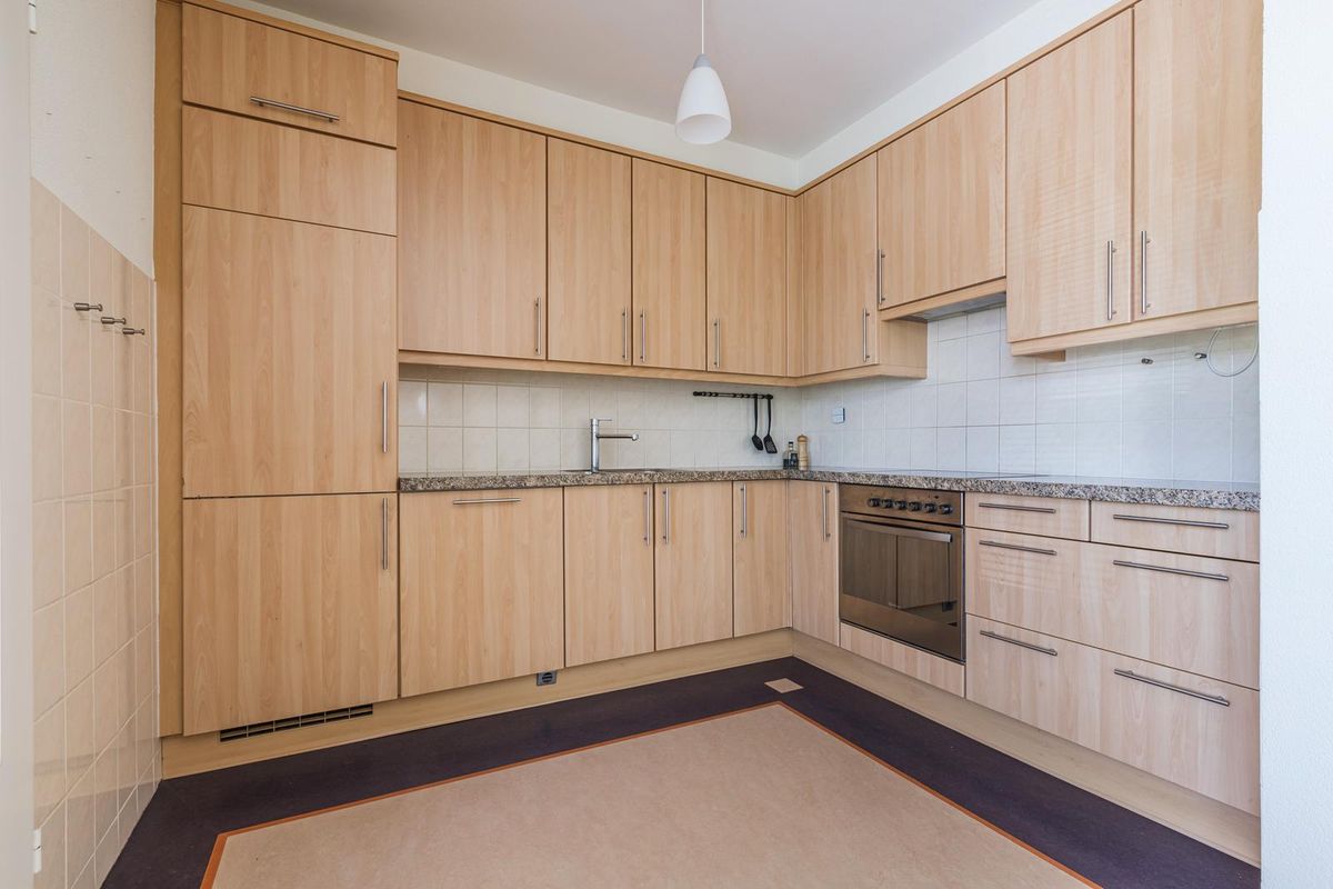 De halfopen keuken in hoekopstelling bevindt zich aan de voorzijde van het huis en is uitgevoerd met lichte fronten en een stijlvol werkblad. De keuken is voorzien van alle benodigde apparatuur: een oven, inductiefornuis, afzuigkap en een koel-vriescombinatie. Vanuit de keuken lopen we door naar de woonkamer.