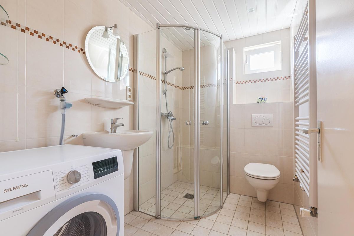 De volledig betegelde badkamer is uitgevoerd in lichte kleuren en voorzien van een douchehoek, wastafel, hangcloset en een aansluiting voor de wasmachine.