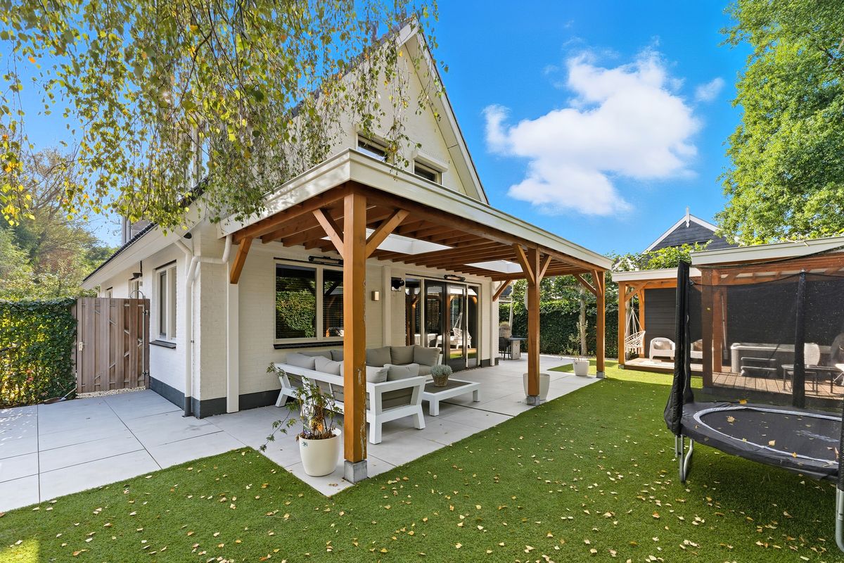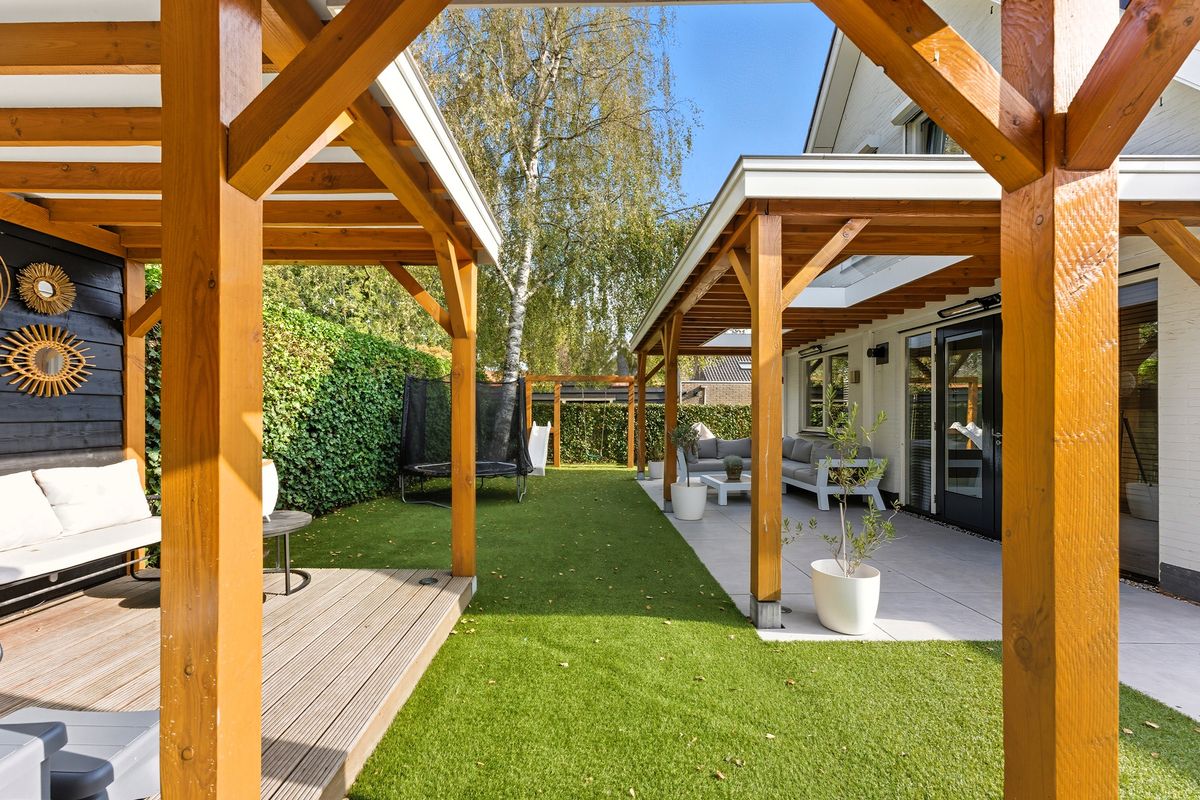 Achtertuin: Wat een heerlijke achtertuin op een perceel van 385 m². Volledige privacy en mooi aangelegd met een combinatie van sierbestrating, onderhoudsvriendelijk kunstgras en meerdere terrassen. Er zijn volop mogelijkheden om te loungen, te dineren of te zonnen. De dubbele overkapping met jacuzzi maakt het plaatje compleet en nodigt uit om het hele jaar door te genieten, of het nu een zonnige zomeravond is of een knusse winteravond. Dankzij de twee keer openslaande deuren is er een mooie verbinding tussen binnen en buiten.