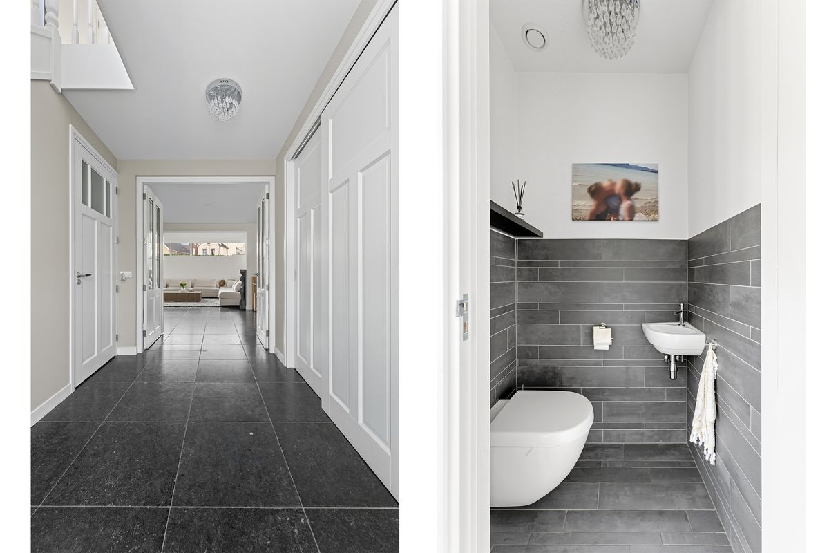 Entree: Bij binnenkomst in de ruime hal voel je direct de kwaliteit van deze woning. De plavuizen vloer met vloerverwarming loopt door over de gehele begane grond en de gestuukte wanden en plafonds geven een verzorgde indruk. De mooie binnendeuren en kozijnen vallen direct op. Vanuit de hal heb je toegang tot de meterkast, een praktische kastenwand met kapstok, trapkast, de toiletruimte en via openslaande deuren naar de woonkamer.