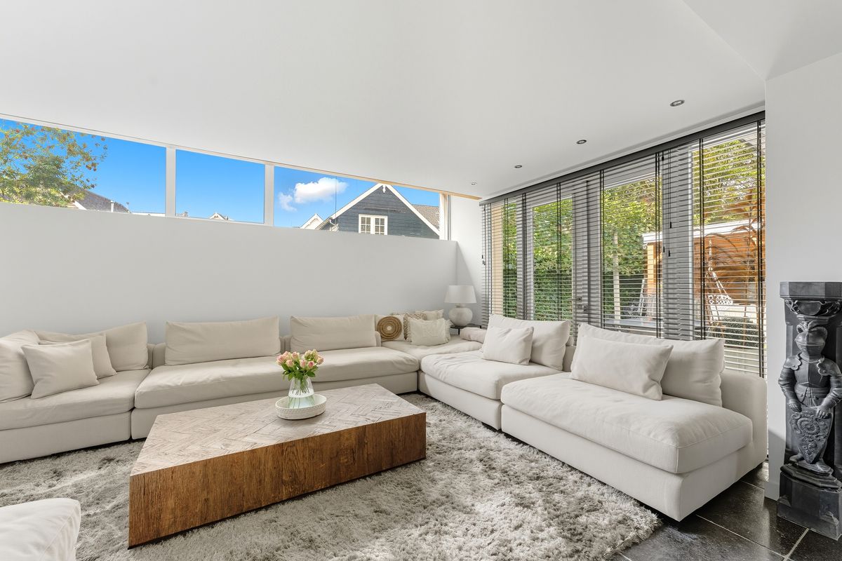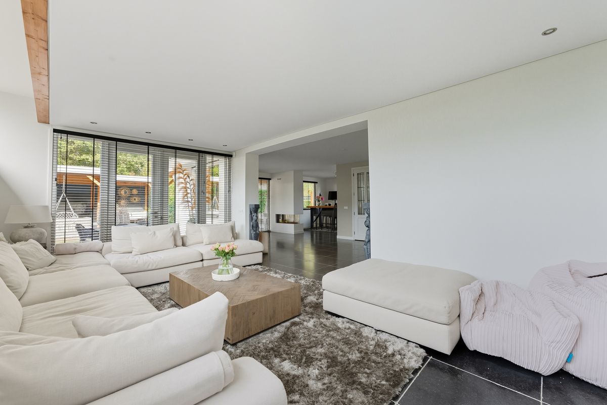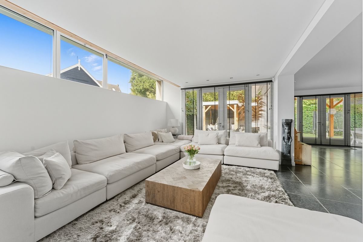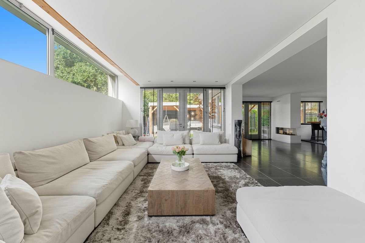 Woonkamer: De woonkamer is royaal, licht en sfeervol. De gashaard vormt een gezellige blikvanger bij het zitgedeelte. Dankzij de vele raampartijen, meerdere openslaande deuren naar de tuin en de vloerverwarming is dit een heerlijke plek om te wonen. De ingebouwde kastenwand met tv-nis zorgt voor een strak geheel. En-suitedeuren scheiden de woonkamer van de keuken.