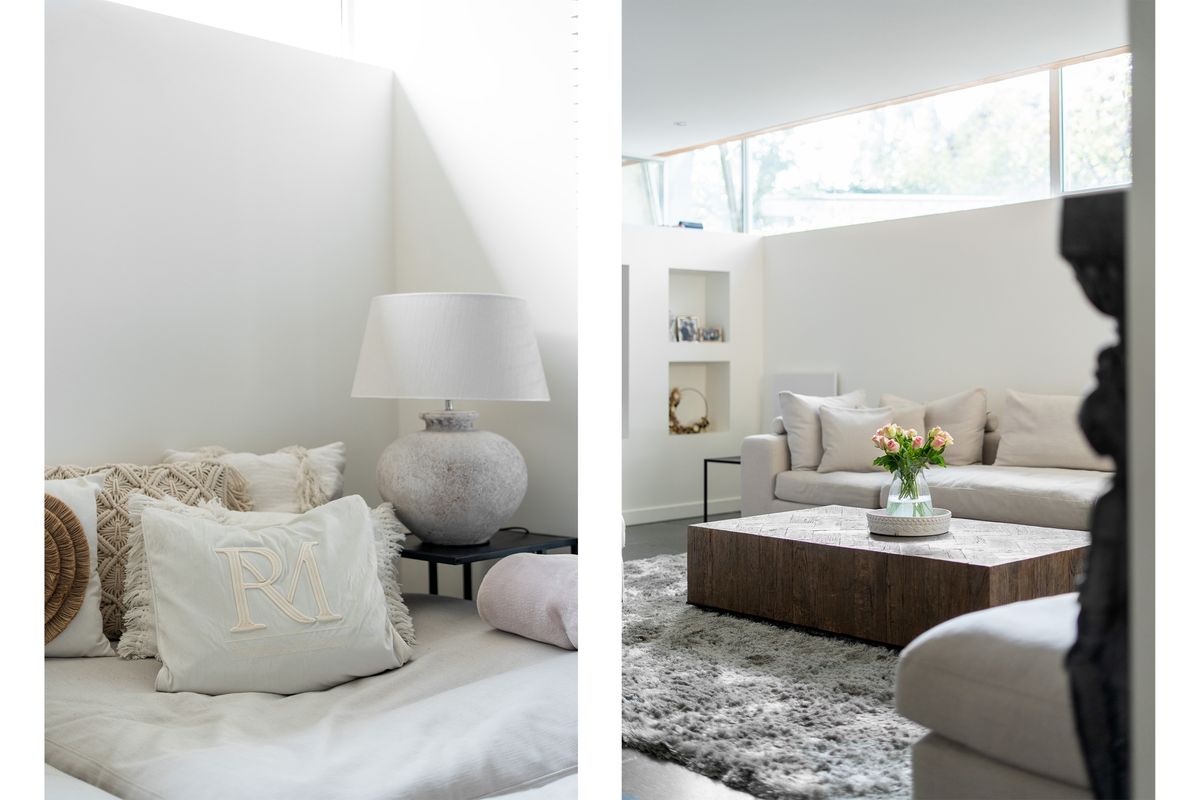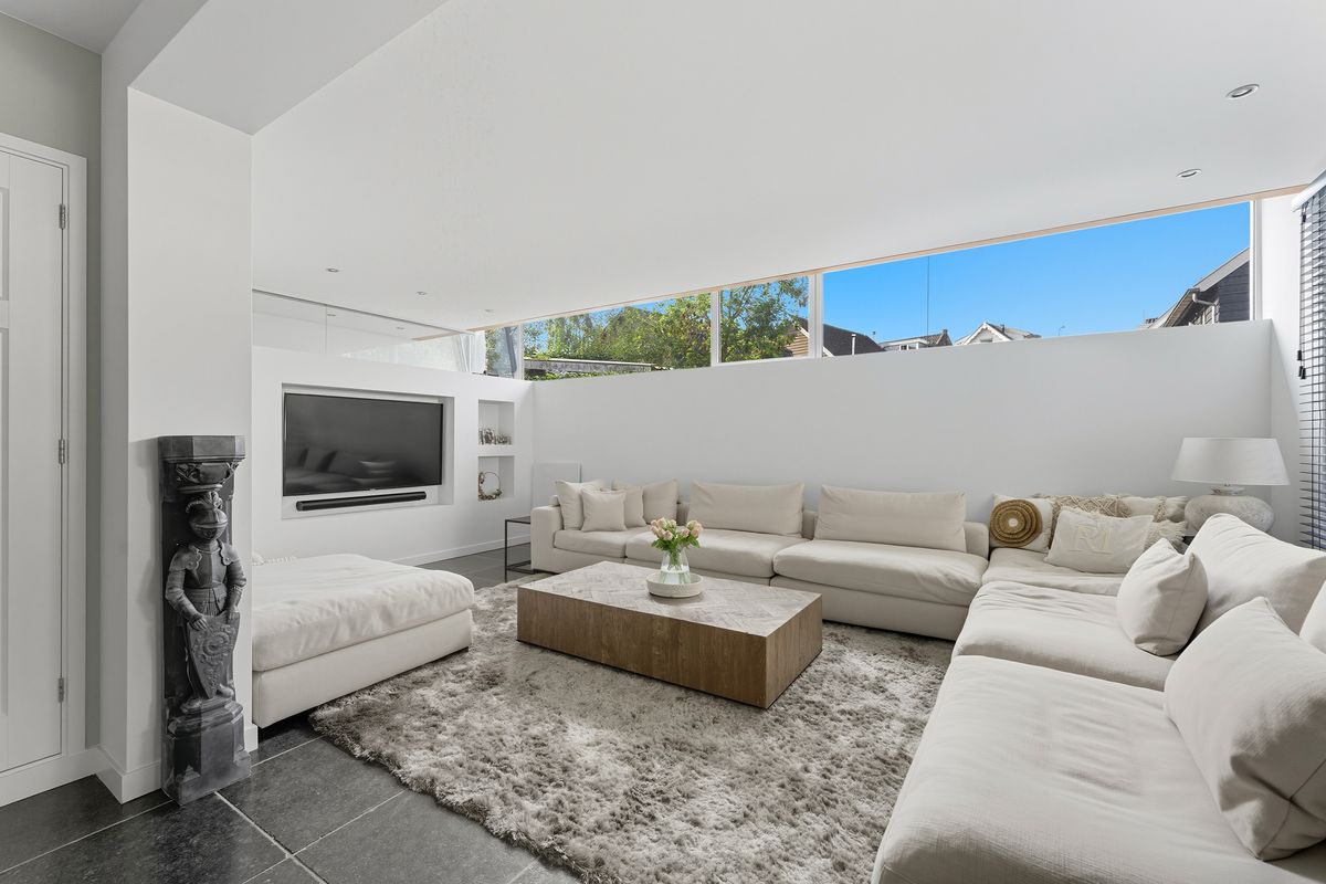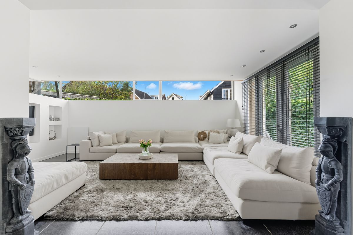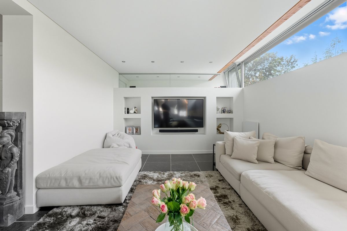 Woonkamer: De woonkamer is royaal, licht en sfeervol. De gashaard vormt een gezellige blikvanger bij het zitgedeelte. Dankzij de vele raampartijen, meerdere openslaande deuren naar de tuin en de vloerverwarming is dit een heerlijke plek om te wonen. De ingebouwde kastenwand met tv-nis zorgt voor een strak geheel. En-suitedeuren scheiden de woonkamer van de keuken.