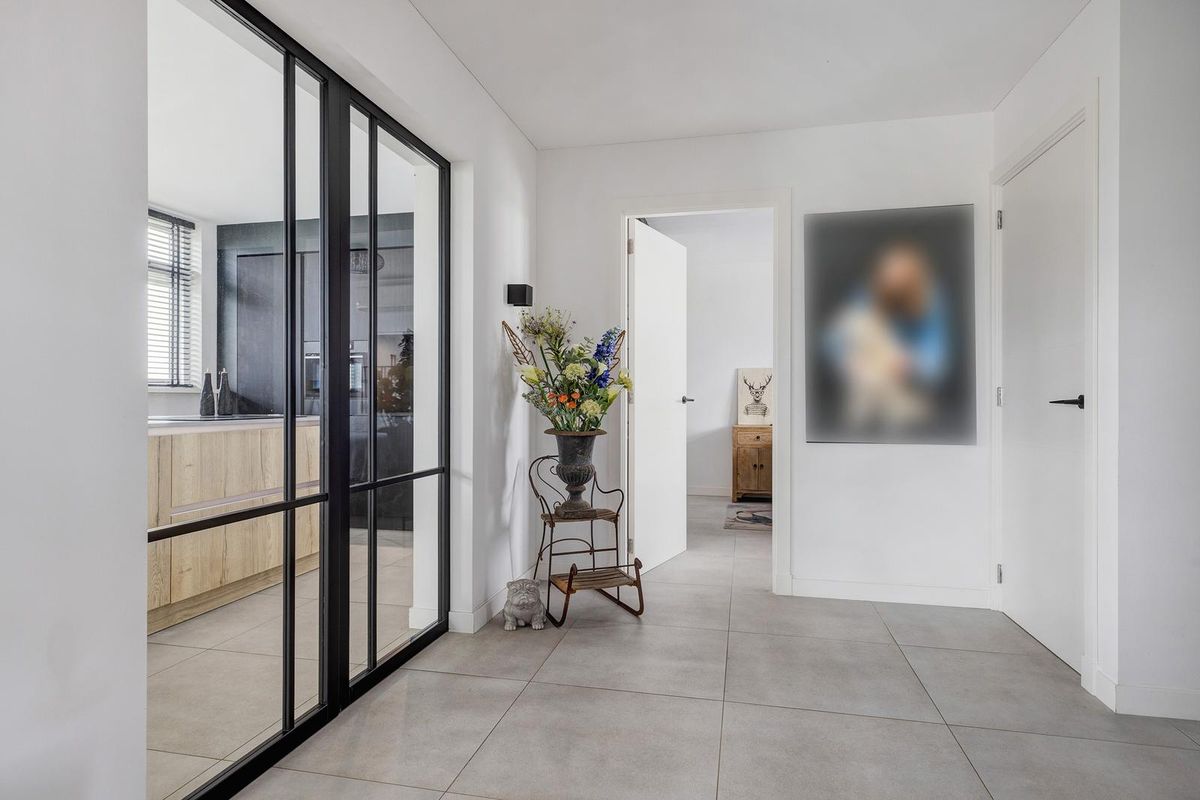 Via de ruime entreehal met de garderobe, meterkast en de toiletruimte betreedt u deze modern afgewerkte woning. De toiletruimte is strak uitgevoerd met glad stucwerk, een hangend toilet en fonteintje. Vanuit de hal heeft u toegang tot de woonkamer, slaapkamer met badkamer ensuite en de keuken, bereikbaar via prachtige zwarte glazen schuifdeuren die direct zorgen voor een stijlvolle en lichte verbinding tussen de ruimtes.