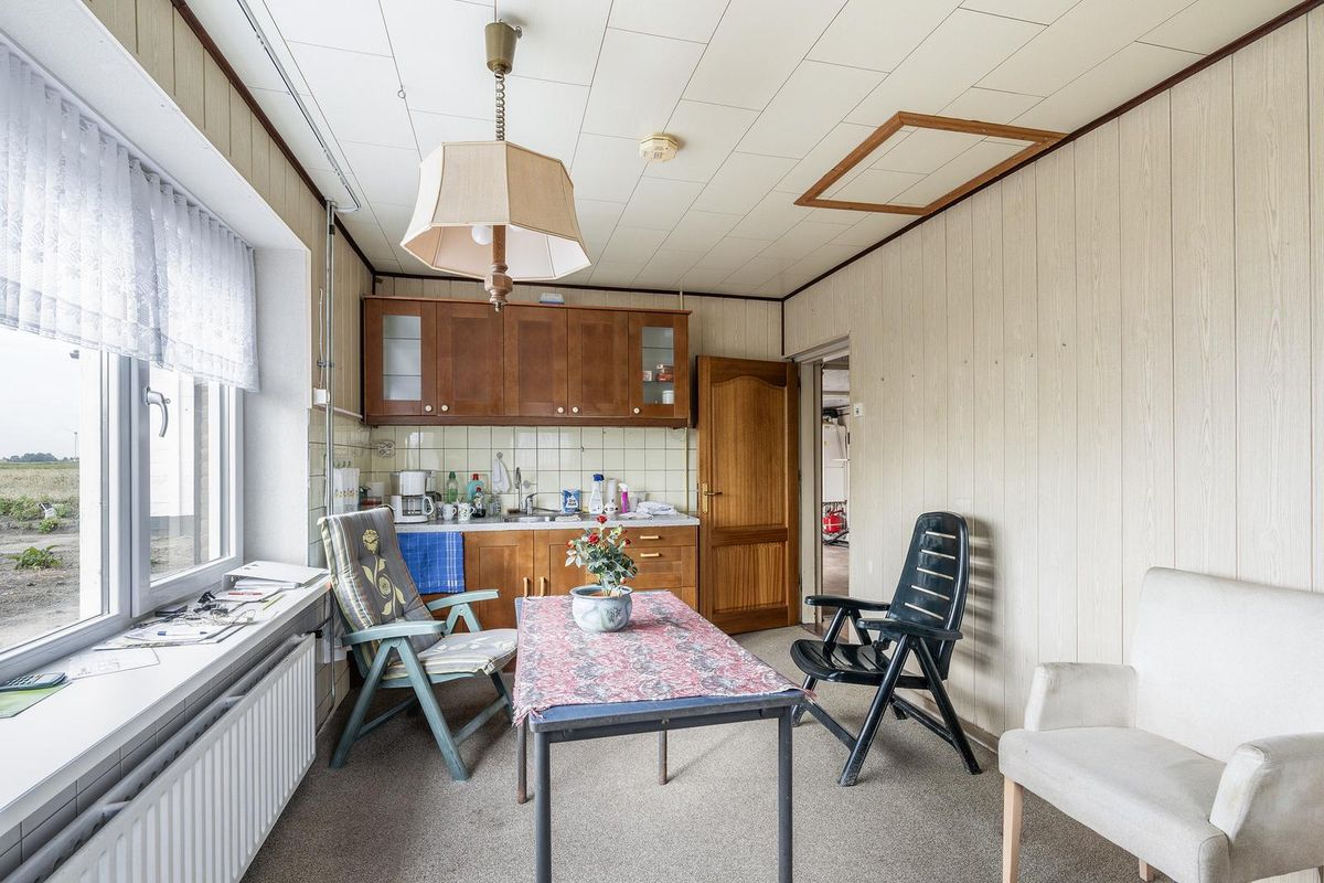 De woonkeuken bevindt zich aan de achterzijde en is in hoekopstelling geplaatst. De keuken heeft een werkblad met spoelbak.