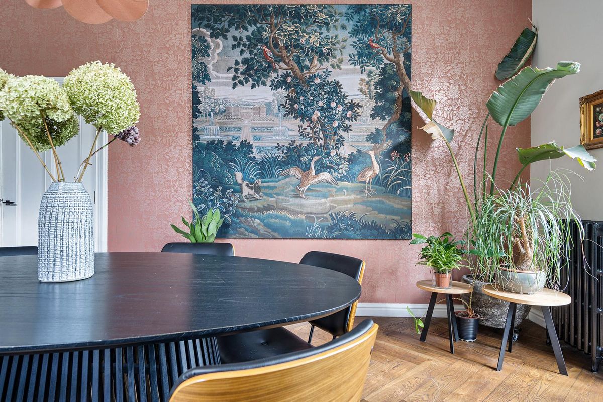 Ook slaapkamer 4 heeft 3 grote inbouwkasten, een grootraampartij met nieuwe kozijnen en dubbel glas en een stijllvolle afwerking op de wanden. Hier is gekozen voor licht sierbehang dat perfect in lijn staat met het zalmroze en terra roze schilderwerk.