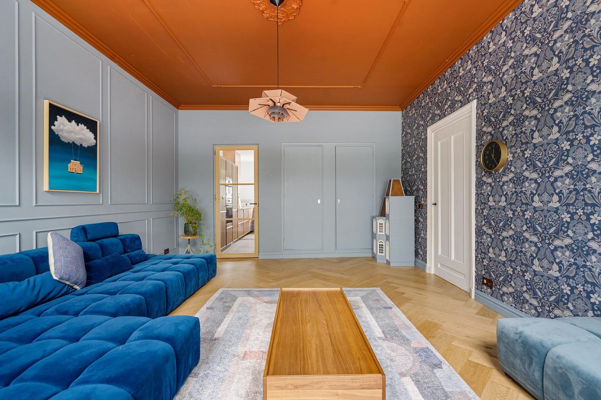 Aan de linkerzijde bevindt zich een tweede woonkamer, ideaal als werkkamer, tv-kamer of speelruimte. De combinatie van klassieke details – zoals het kastanjekleurige plafond en de hoge raampartijen – en moderne afwerkingen zorgt voor een sfeervol geheel.