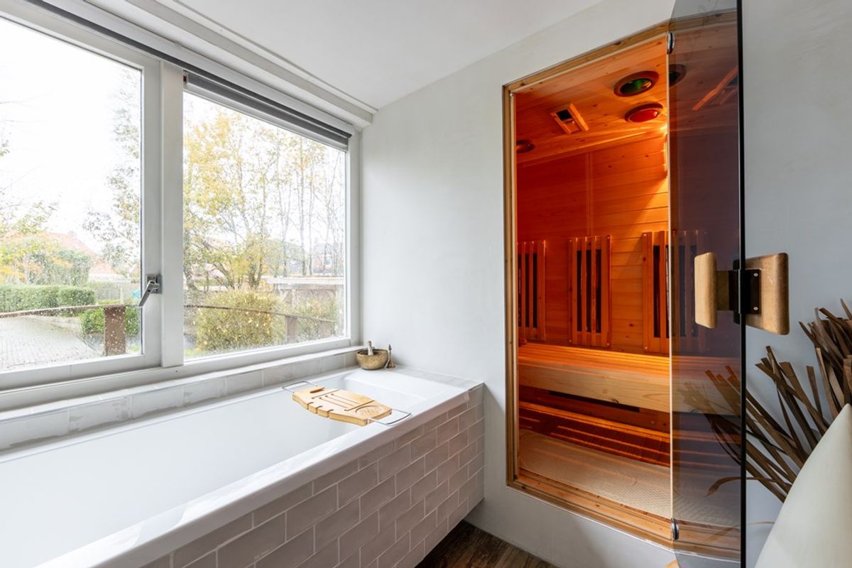 Via de ruime hal op de begane grond, met garderobe en toilet, bereik je de vierde slaapkamer met een eigen badkamer. Deze is uitgerust met een ligbad, een douche met stoomcabine, een infraroodsauna, een wastafelmeubel en vloerverwarming.