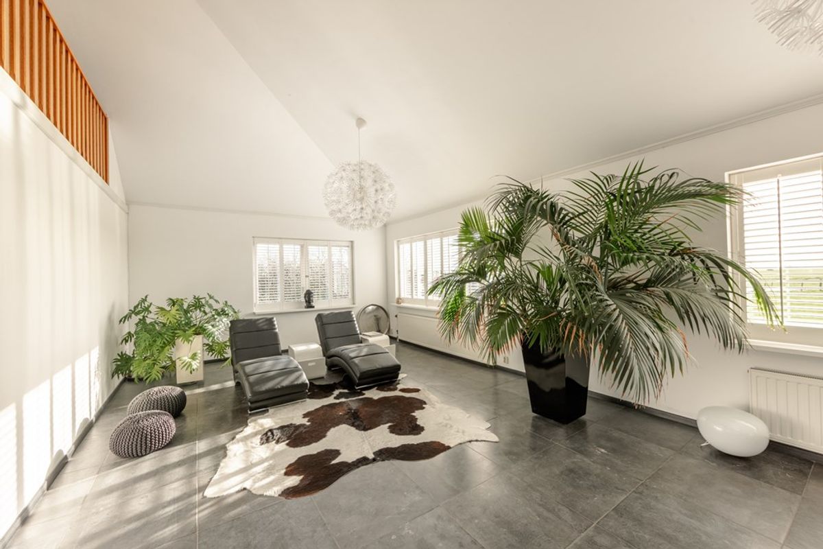 De vloerverwarming ligt over de hele begane grondvloer behalve in de slaapkamer. En dan kom je in de woonkeuken met diverse inbouwapparatuur, een eetkamer en een houtkachel. Wat opvalt aan de raampartijen in de keuken? Dat onder de vloer het voormalige zwembad zit. Dus wil je dat weer terug? Dan kan dat! Vandaar ook dat er nog een kleedkamer met een derde badkamer is. Met een inloopdouche, toilet en wastafelmeubel. Levensloopbestendig dus. En dan is er nog een heerlijke ruime woonkamer!