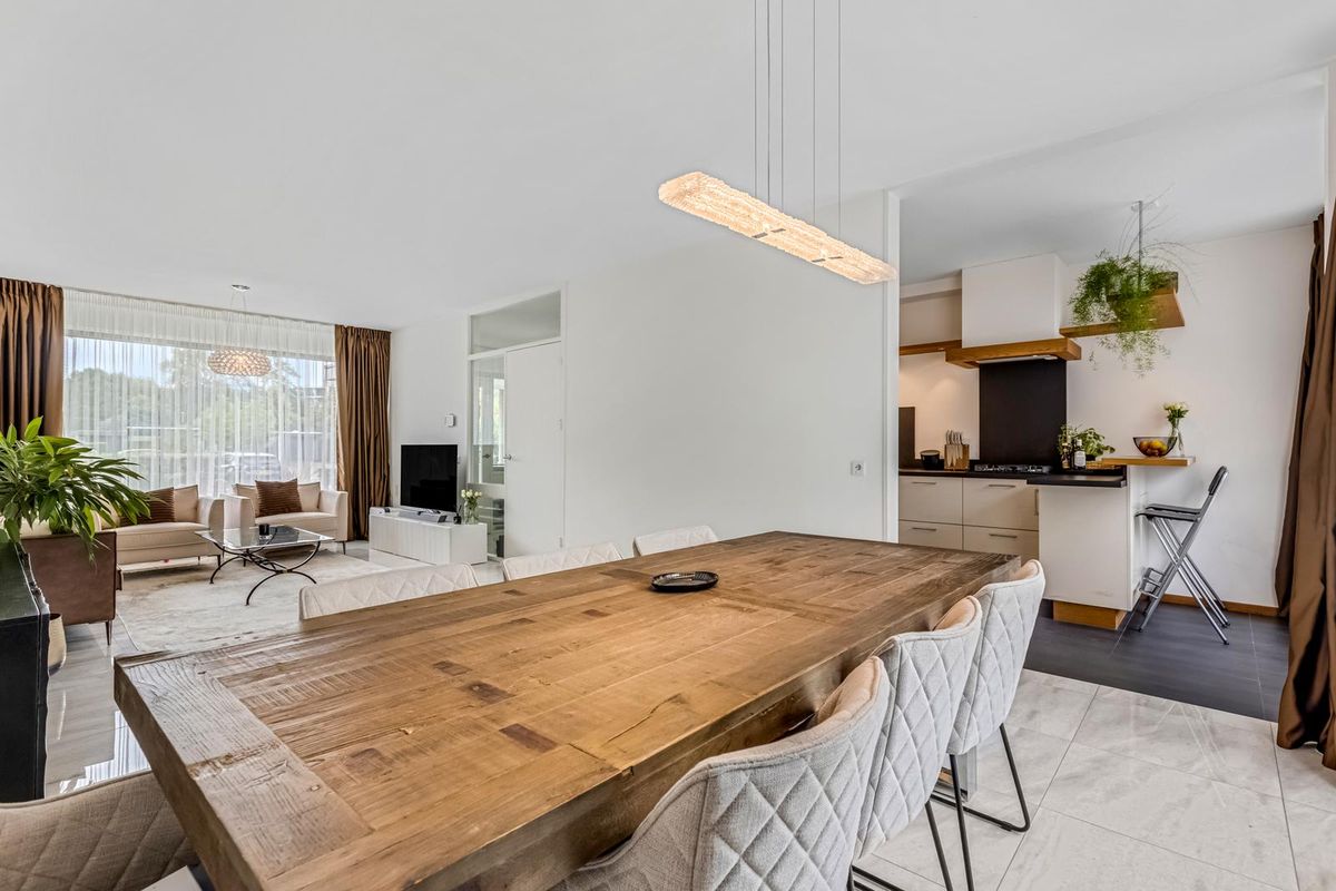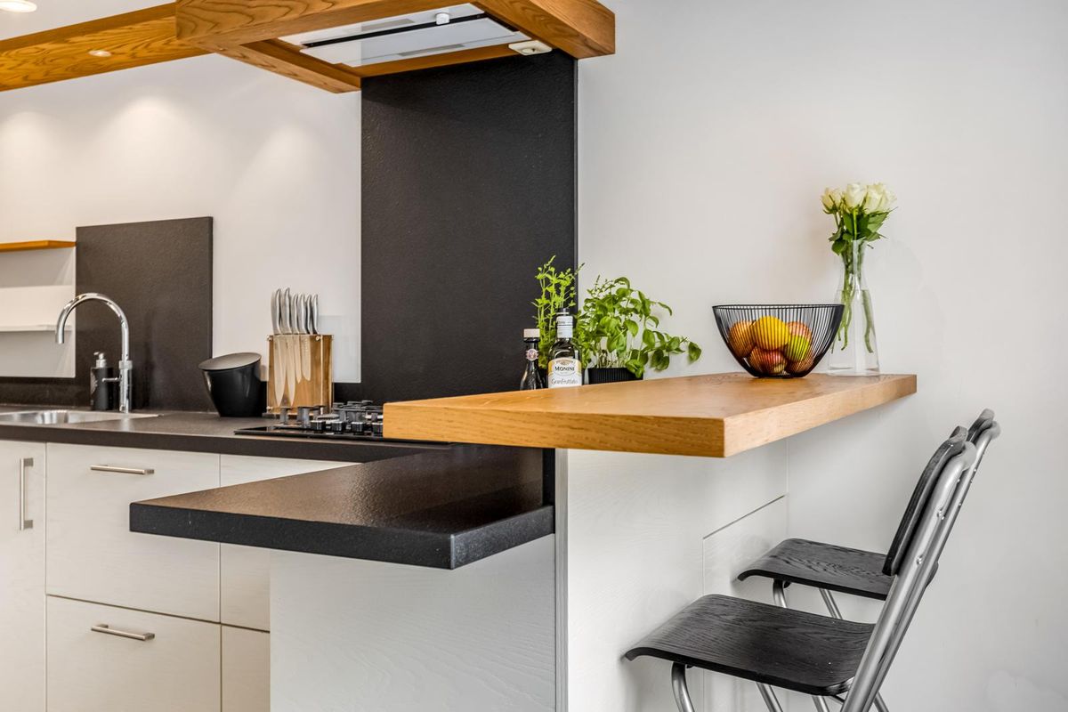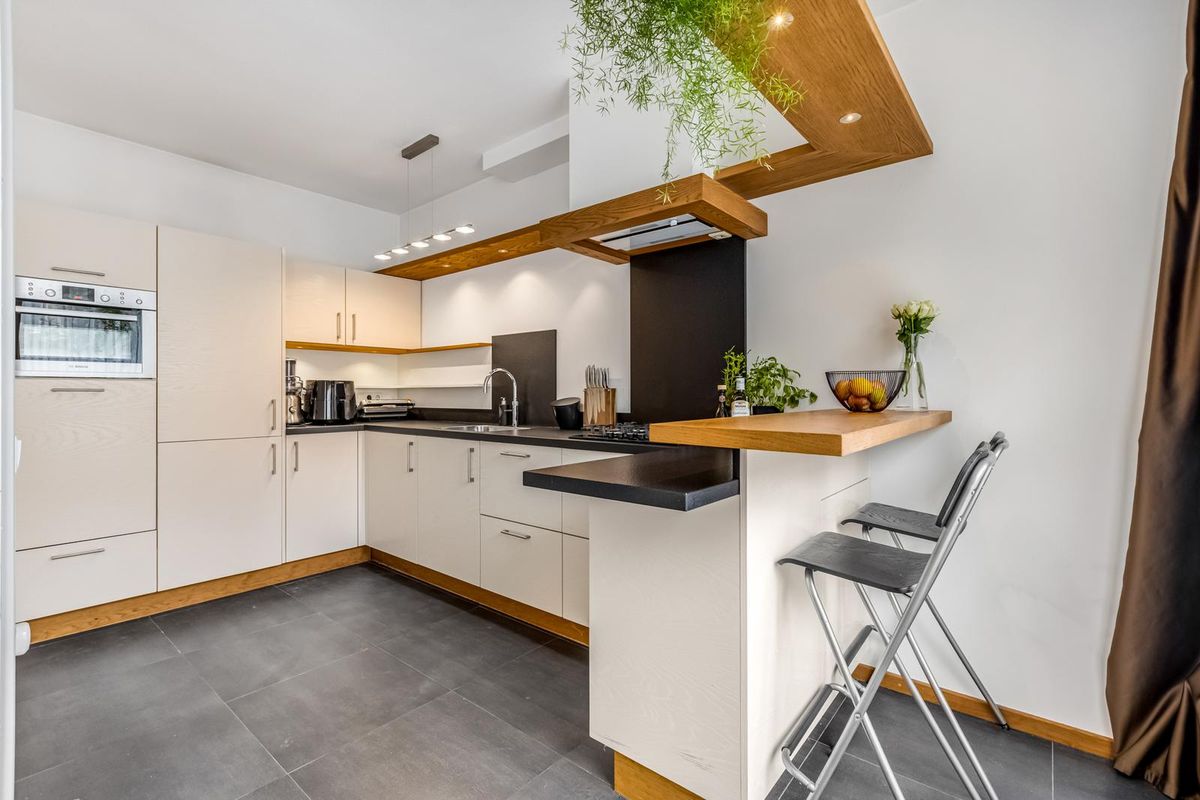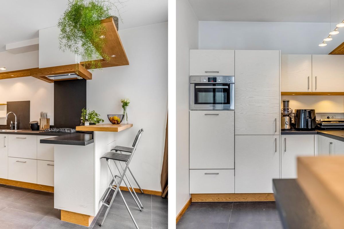 Aan de achterzijde bevindt zich de halfopen keuken. Deze is modern en stijlvol uitgevoerd met een composieten donker werkblad, lichte fronten met houtnerf en fraaie houten details. De keuken is voorzien van diverse inbouwapparatuur zoals een Bosch combi-oven, vaatwasser op hoogte, kokend waterkraan, koel-/vriescombinatie en een 4-pits gasfornuis met afzuigkap. Ook de spots maken het geheel sfeervol en praktisch.