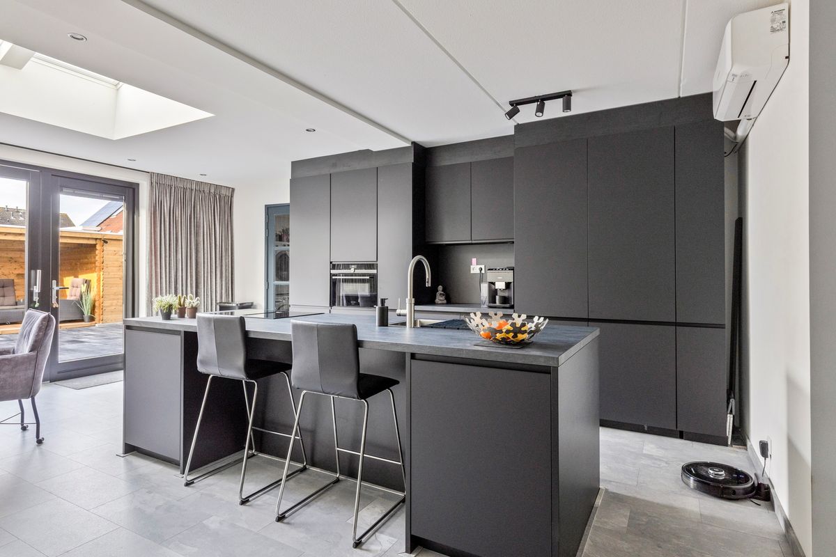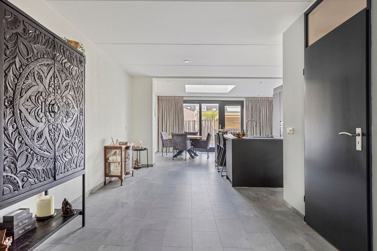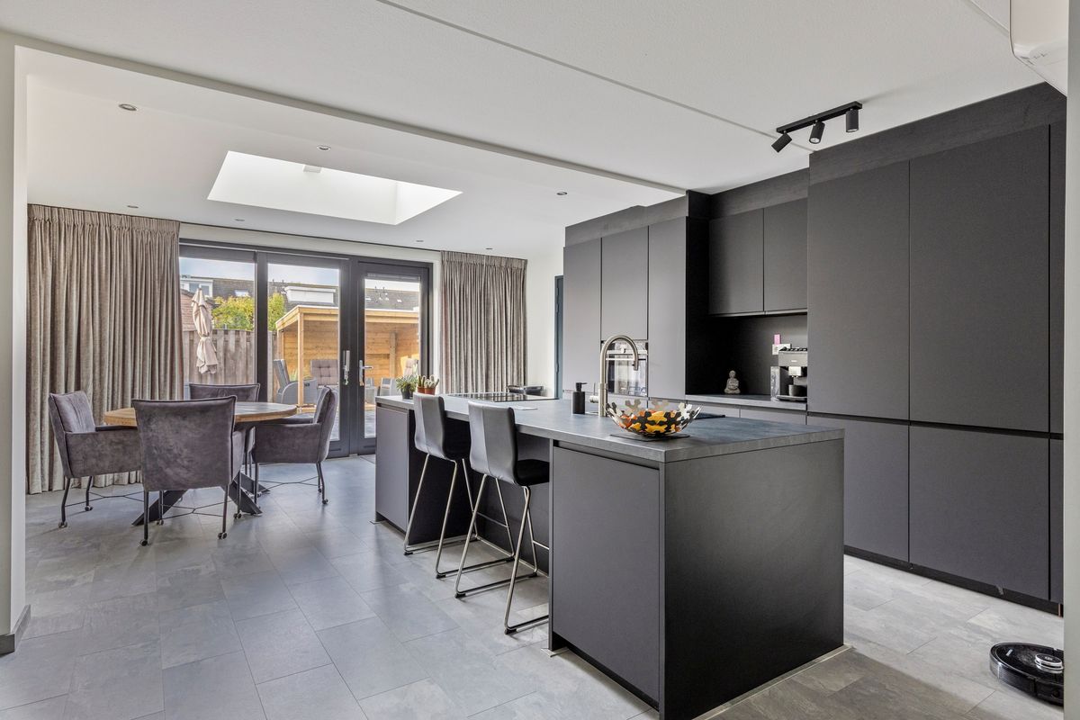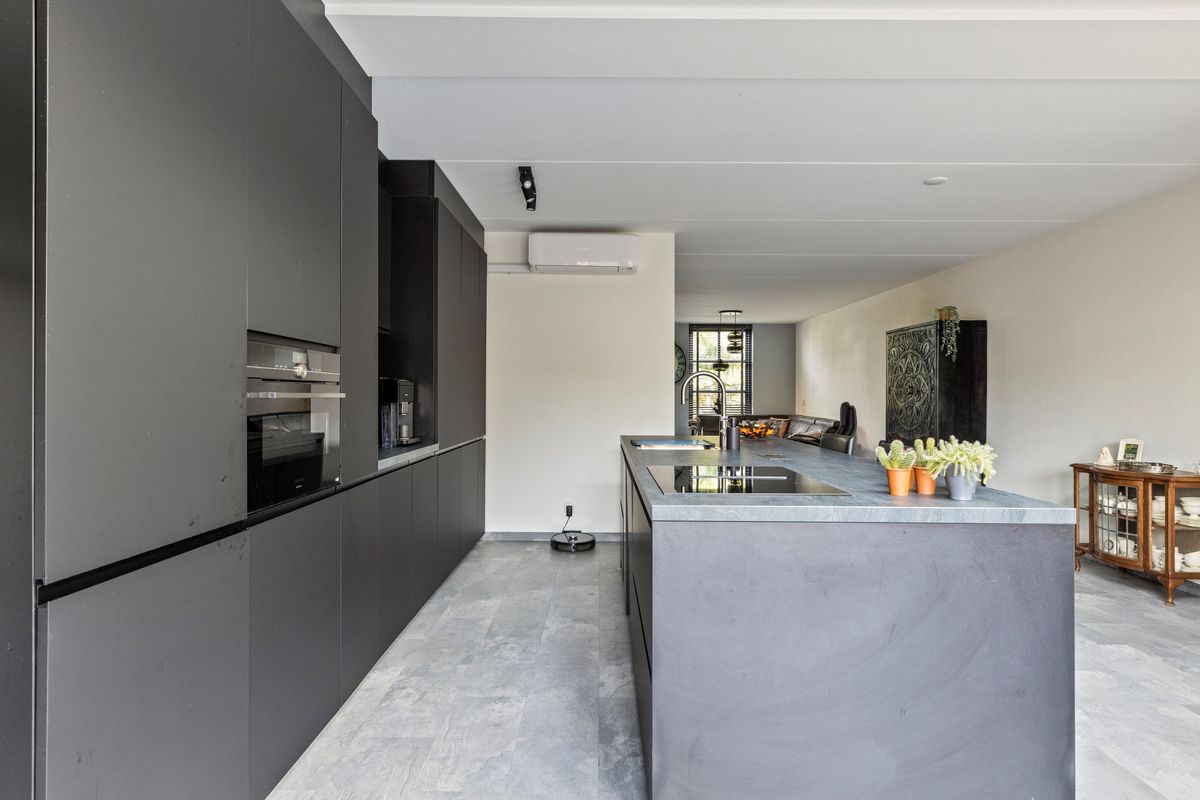 De entree met toilet leidt naar een lichte woonkamer met grote raampartijen, vloerverwarming en een warme, eigentijdse uitstraling. De woonkamer loopt door in de eetkamer en moderne keuken (2024) met kookeiland, hoogwaardige inbouwapparatuur en strak werkblad.