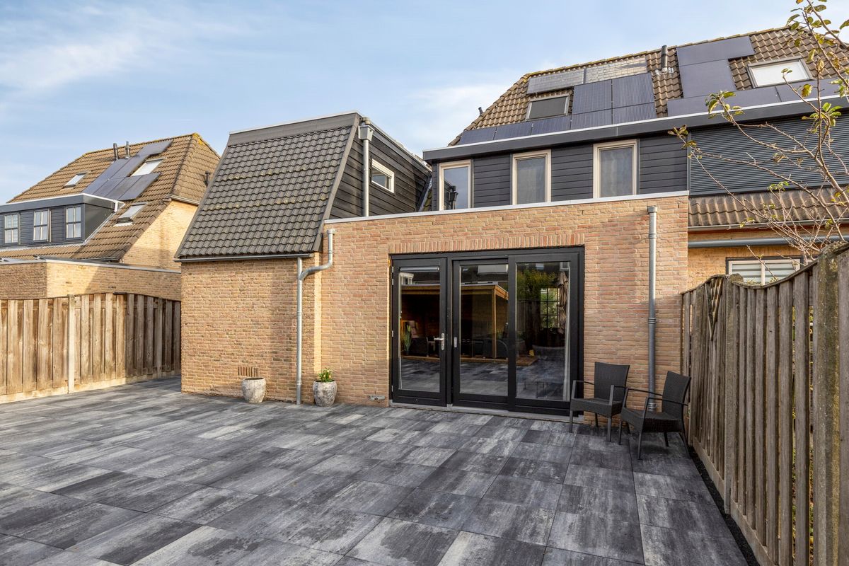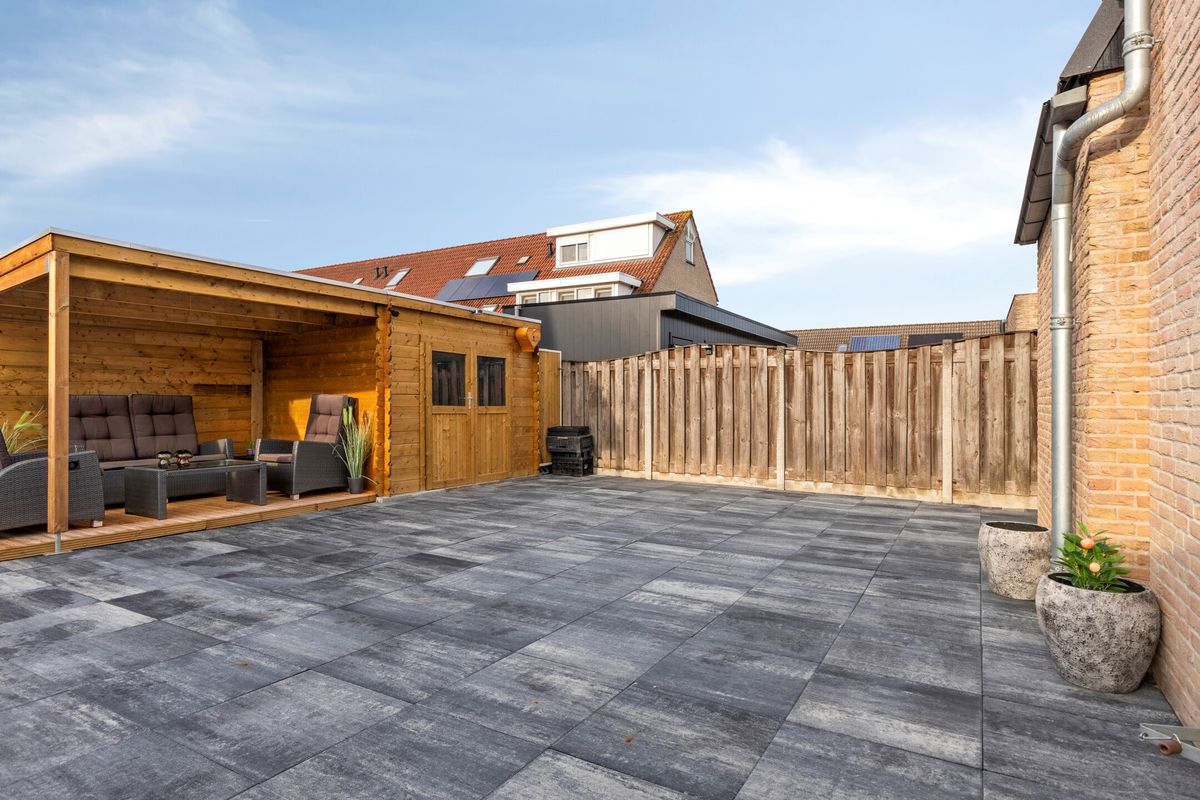 De achtertuin ligt heerlijk op het zuiden en is keurig aangelegd met een groot terras, overkapping en vrijstaande berging.