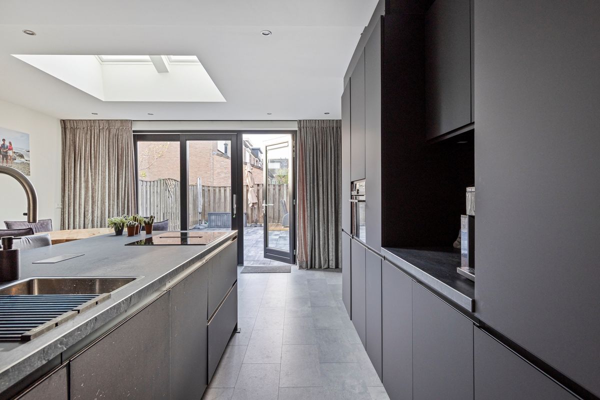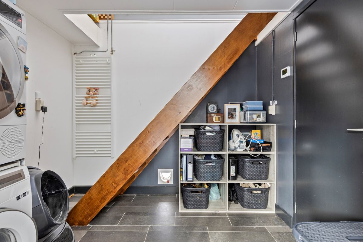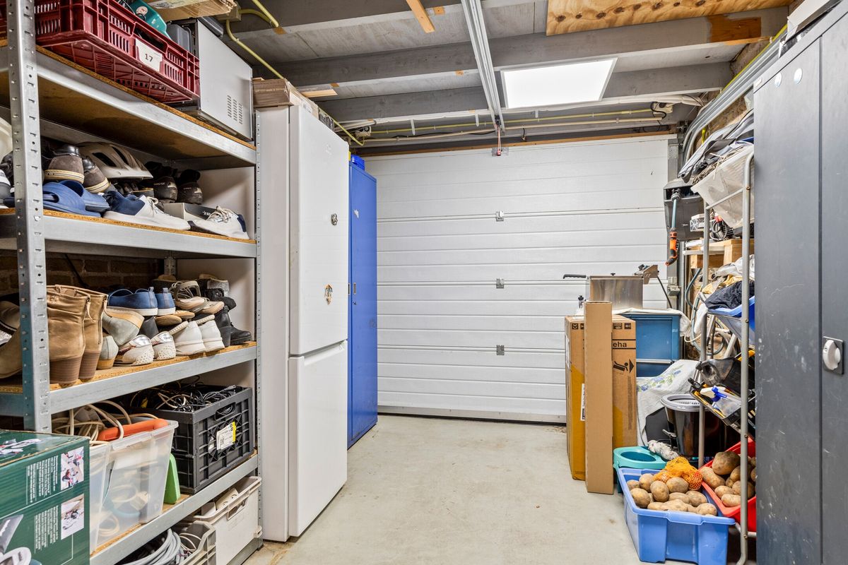 Via de bijkeuken (met wasruimte en extra kastruimte) kom je in de garage, ideaal voor opslag, fietsen of hobby’s.