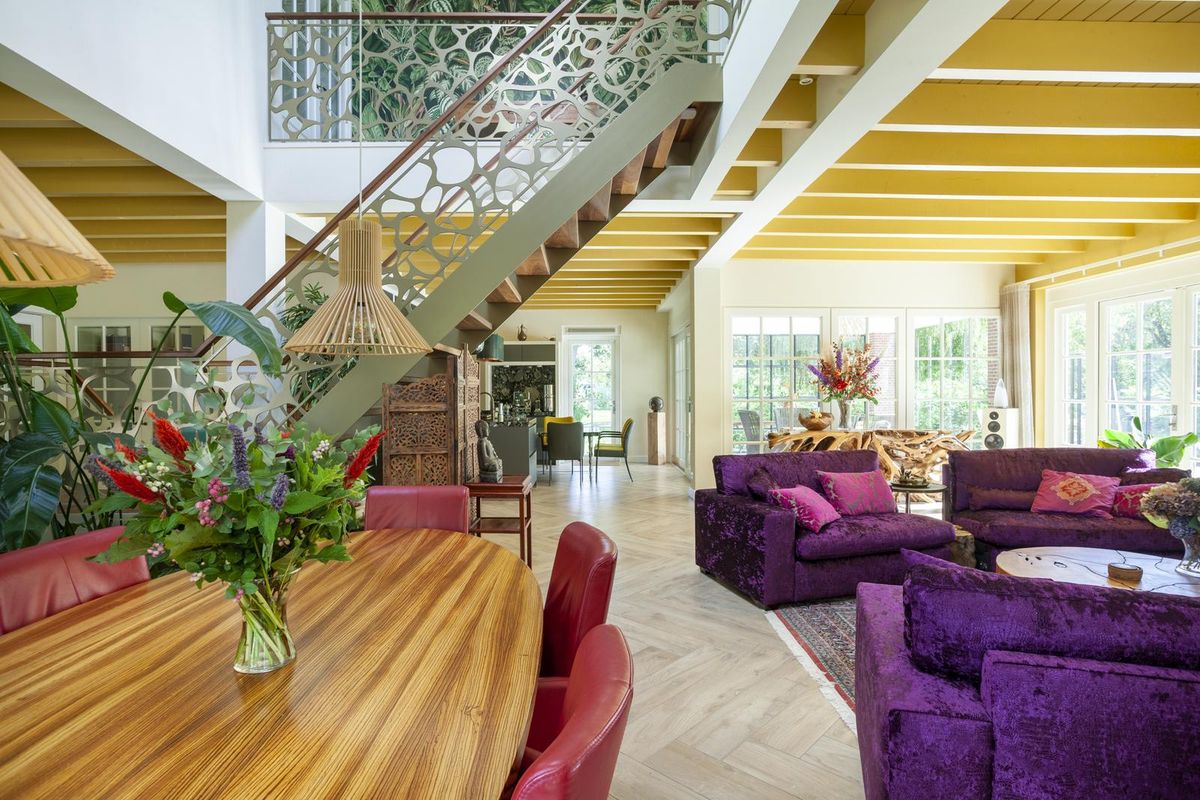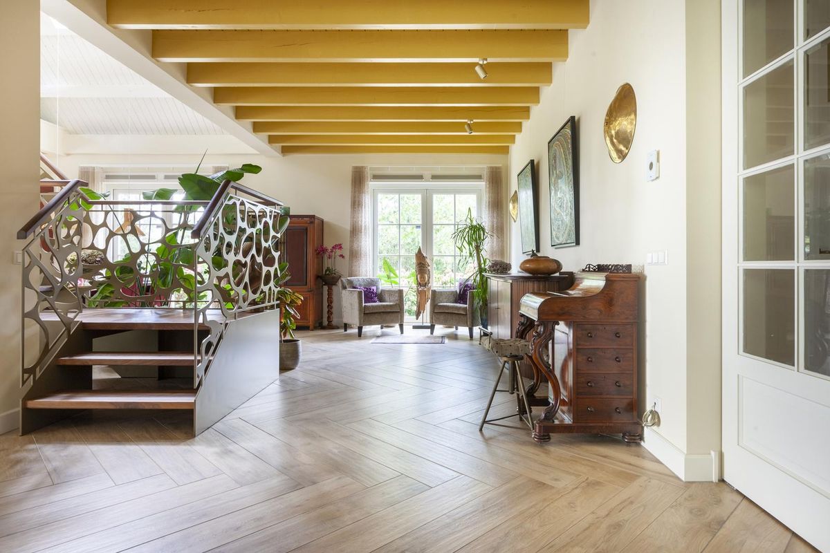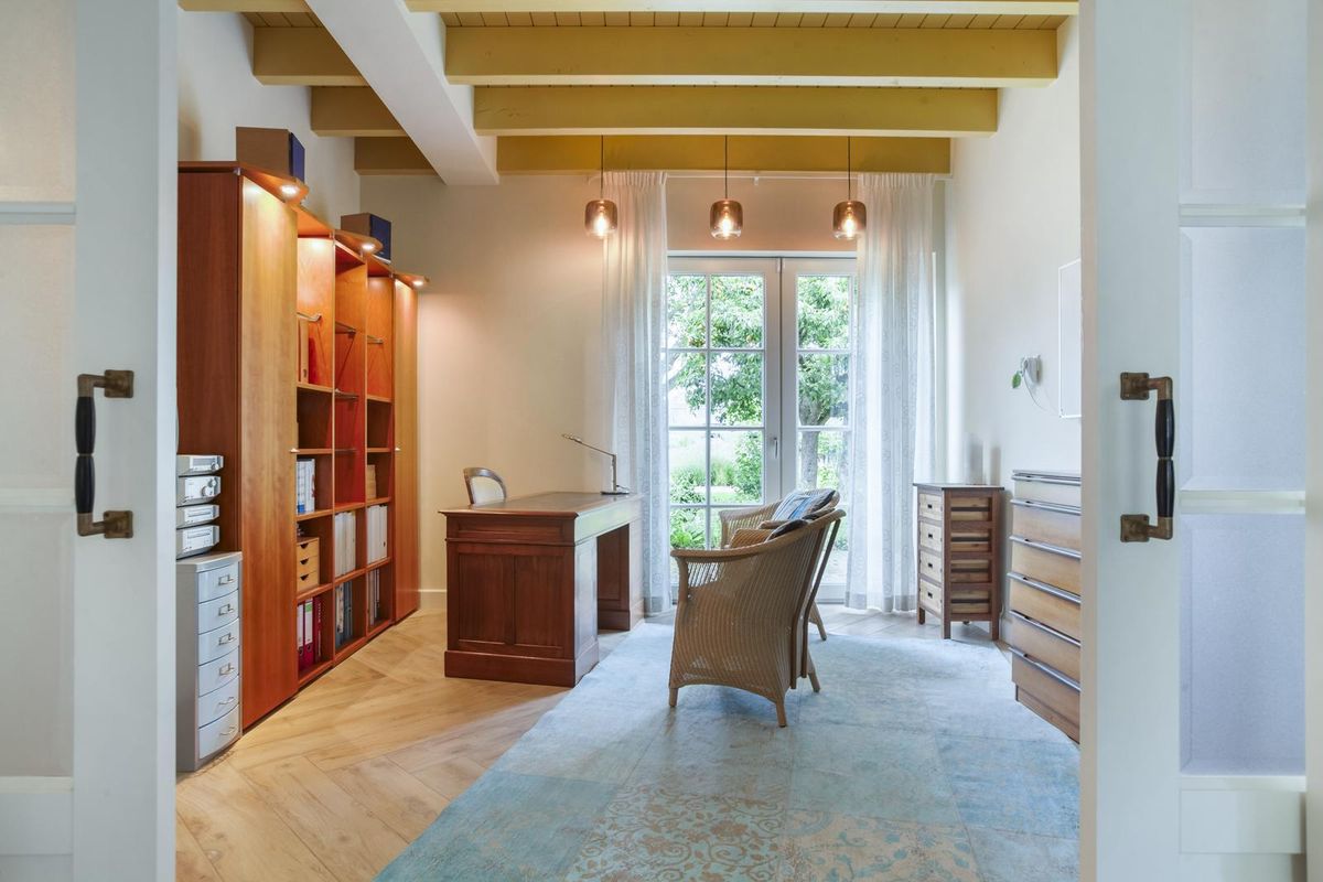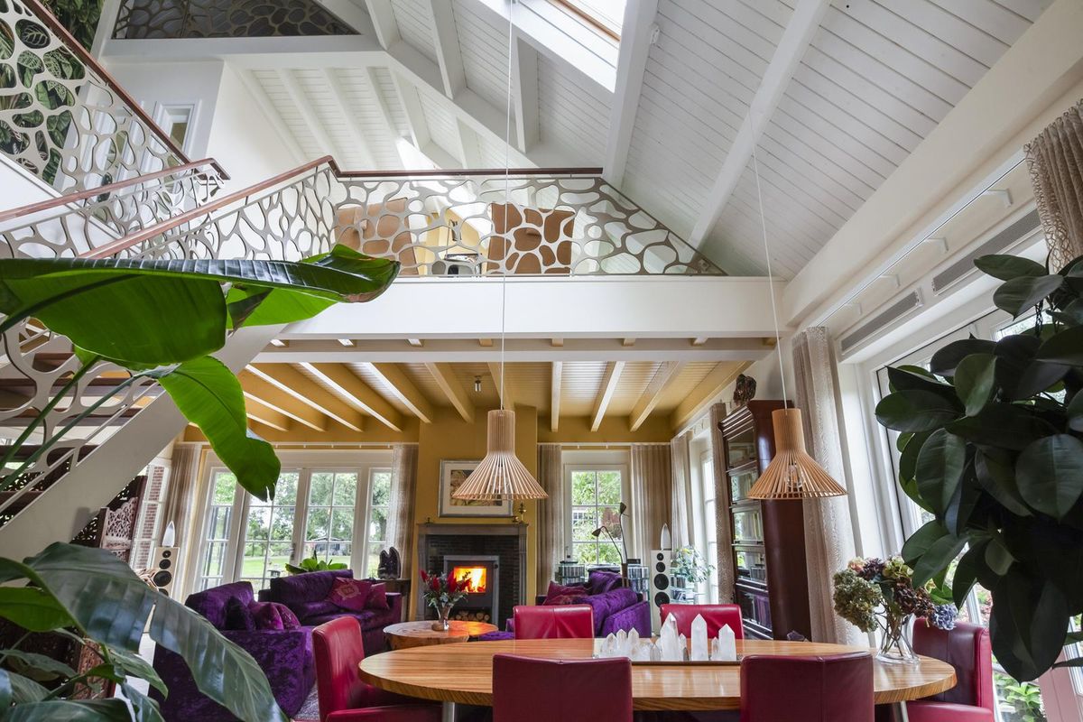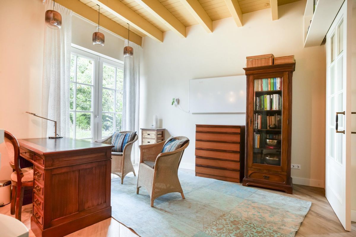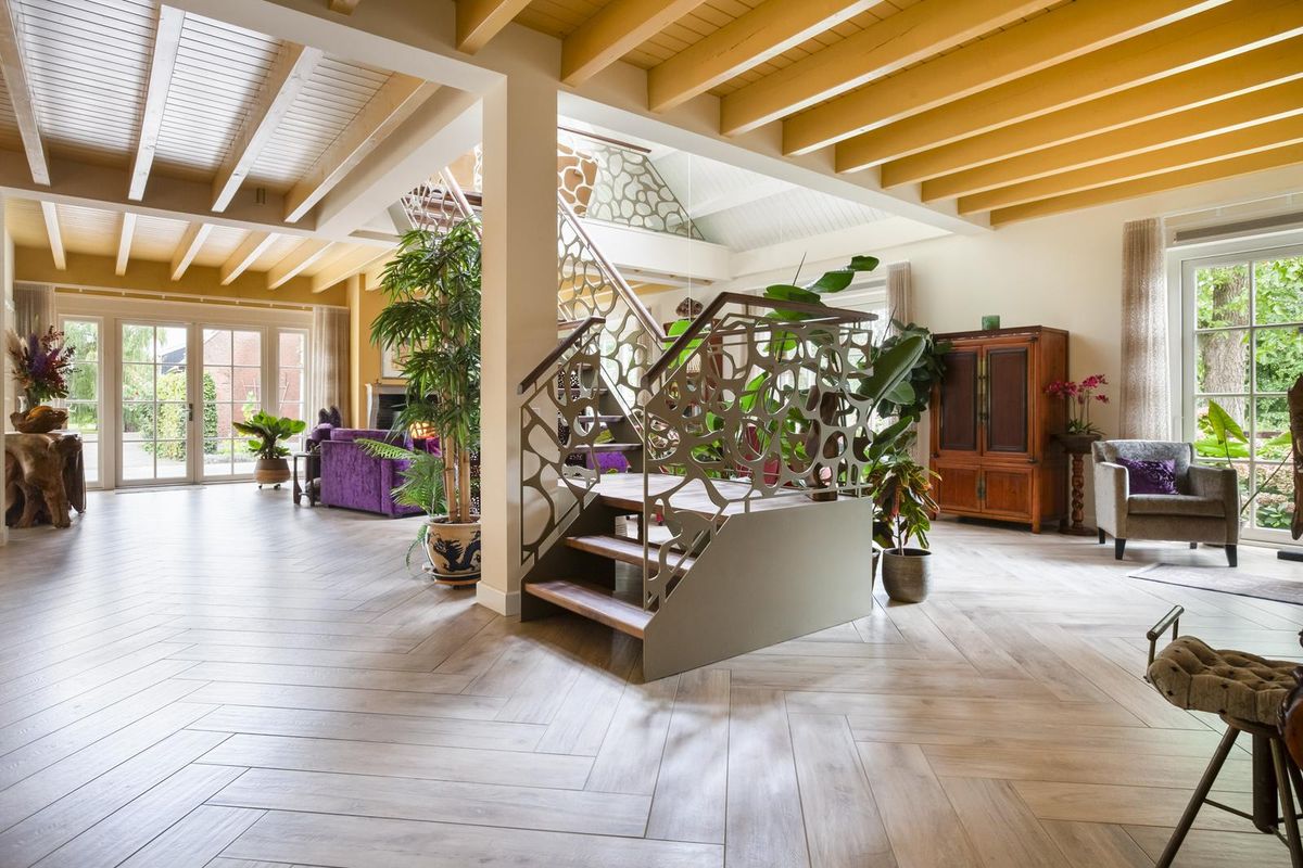 Grenzend aan de hal bevindt zich een elegante werkruimte, die zowel via de hal als via de living toegankelijk is. De living zelf – circa 96 m² groot – ademt warmte en klasse. Het hoge plafond met zichtbare balken en de handgemaakte stalen trap, stijlvol bekleed met duurzaam notenhout, geven de ruimte karakter en allure. Grote raampartijen zorgen voor een overvloed aan daglicht en een prachtig uitzicht over het perceel en het polderlandschap daarachter.