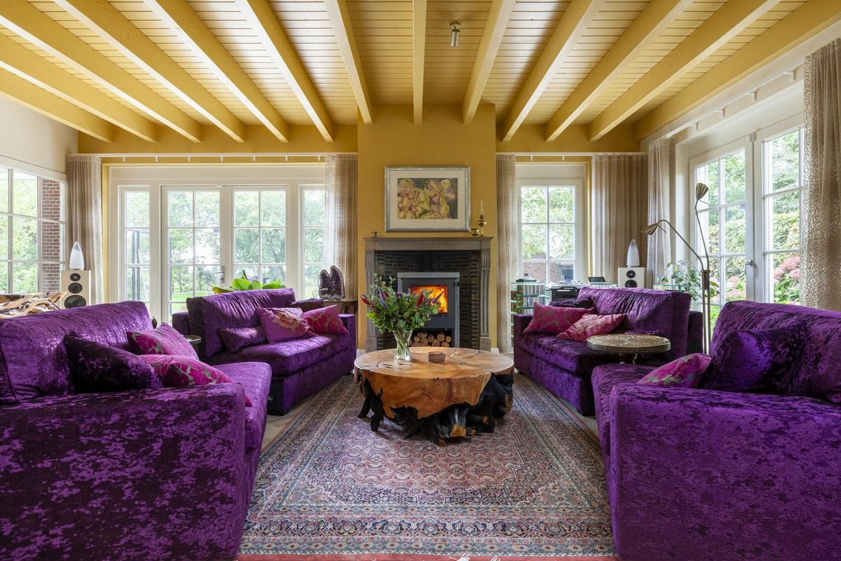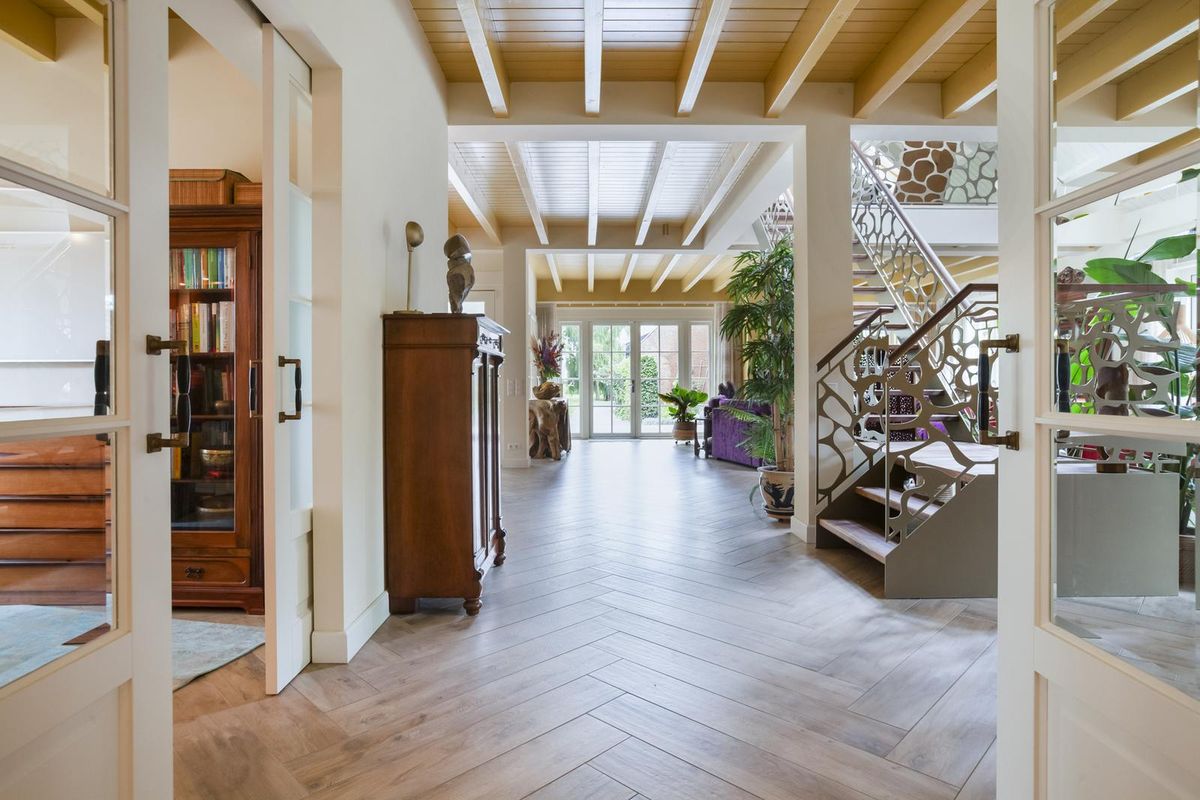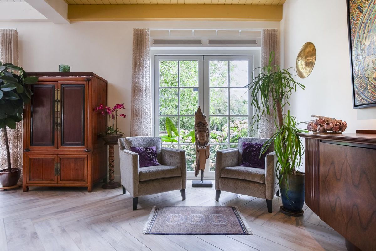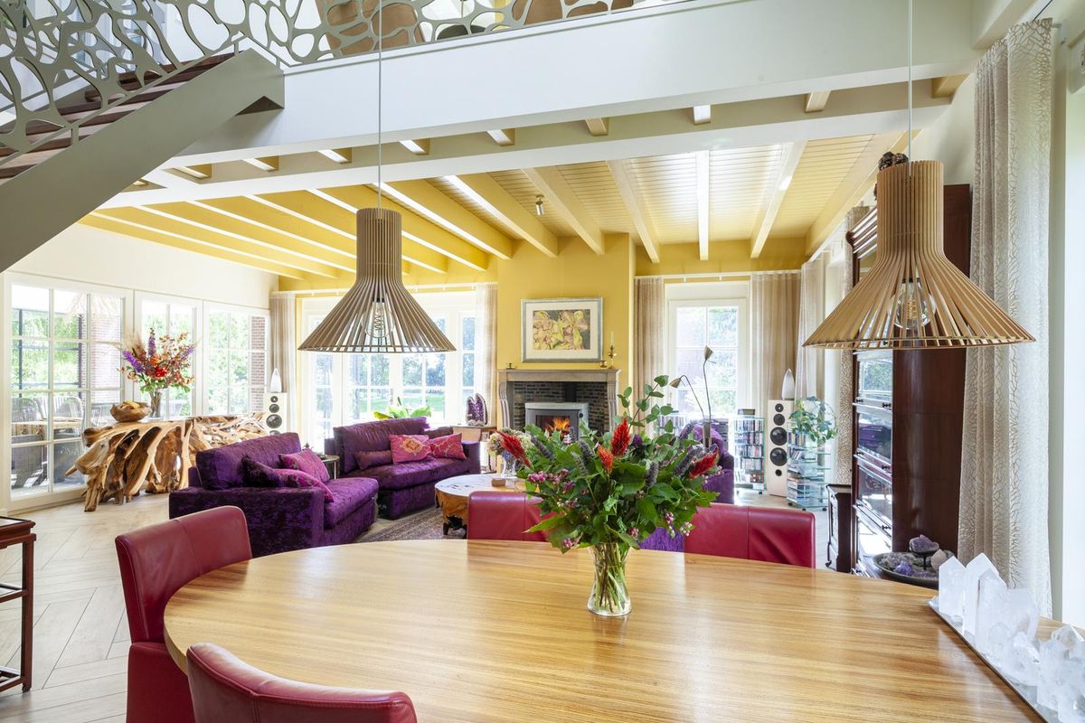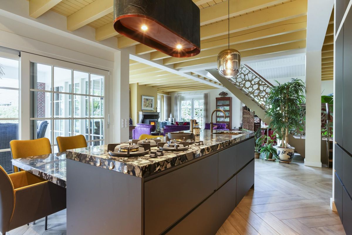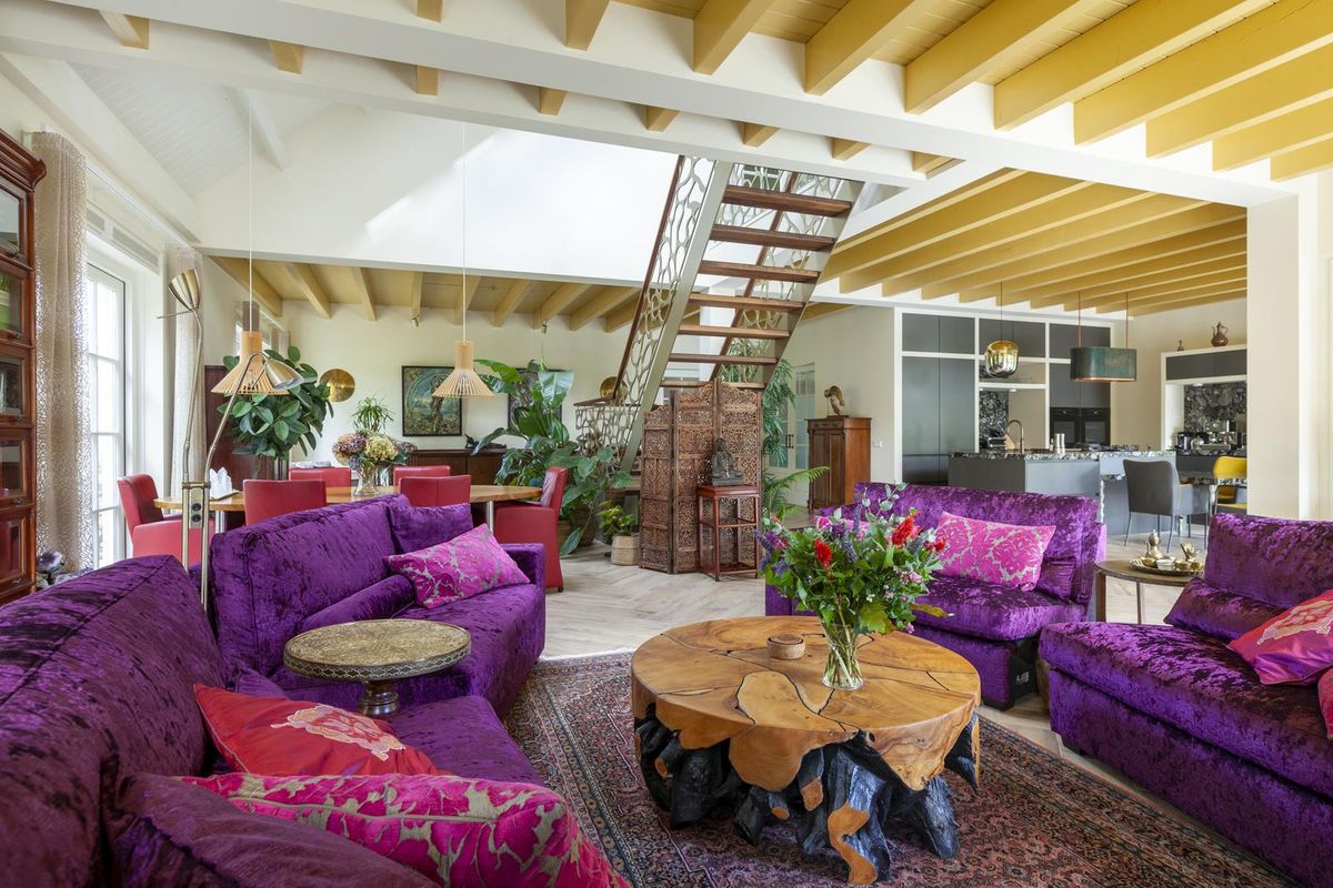 Grenzend aan de hal bevindt zich een elegante werkruimte, die zowel via de hal als via de living toegankelijk is. De living zelf – circa 96 m² groot – ademt warmte en klasse. Het hoge plafond met zichtbare balken en de handgemaakte stalen trap, stijlvol bekleed met duurzaam notenhout, geven de ruimte karakter en allure. Grote raampartijen zorgen voor een overvloed aan daglicht en een prachtig uitzicht over het perceel en het polderlandschap daarachter.
