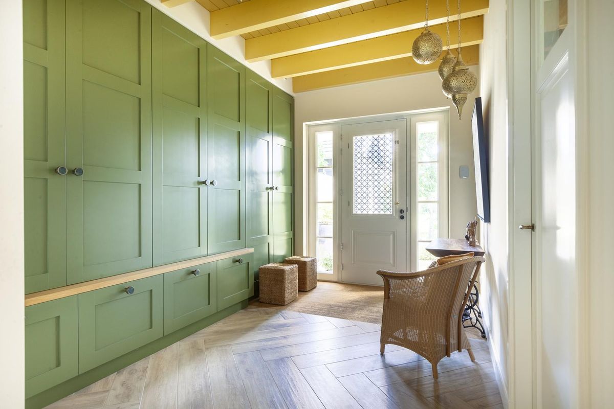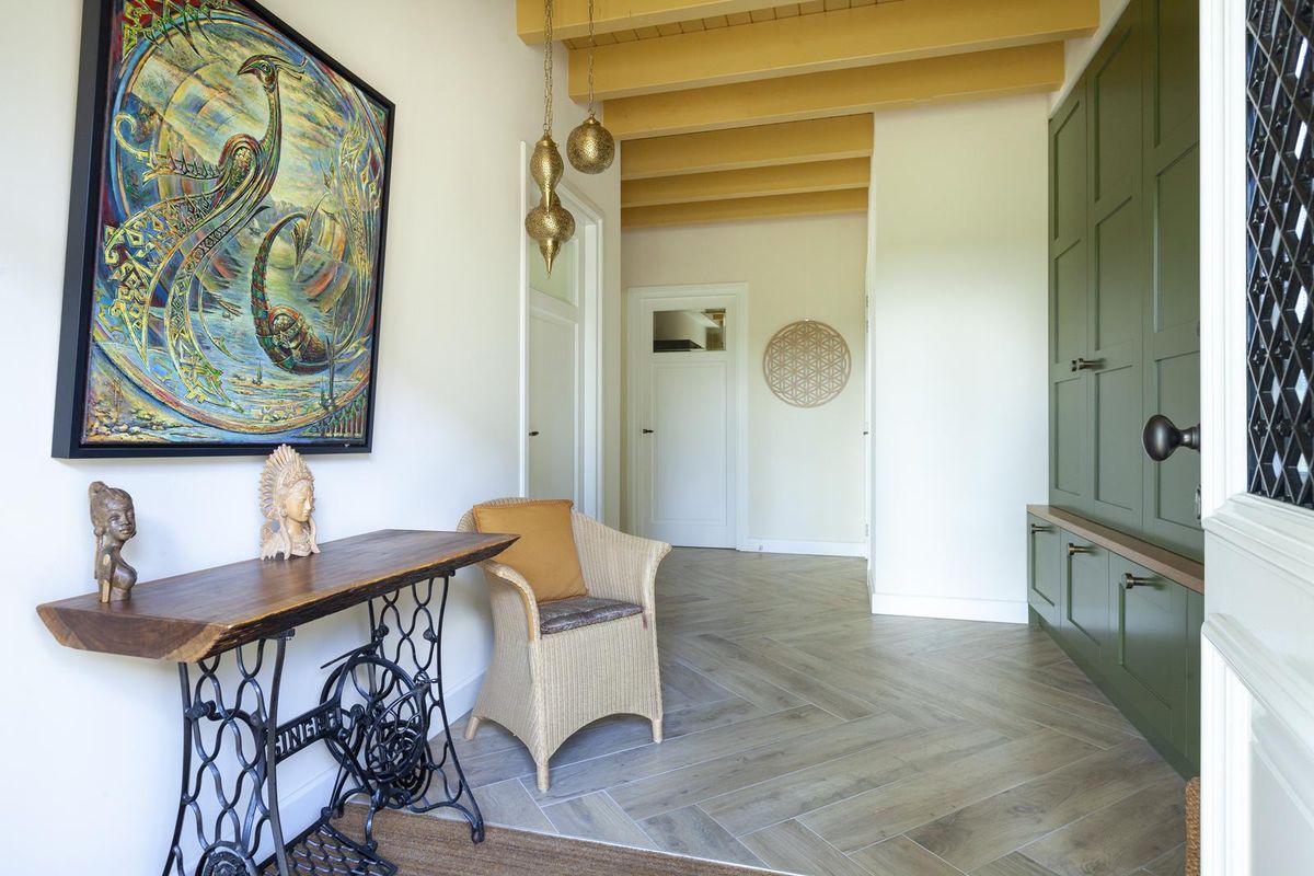 Via de fraaie voordeur betreedt u een indrukwekkende entree. De ruime hal, strak van opzet, verwelkomt u met een handgemaakte kastenwand van formaat – een echte eyecatcher – en een uiterst moderne toiletruimte. Vanuit hier heeft u toegang tot een comfortabele slaapkamer met eigen badkamer op de begane grond; ideaal voor gasten, mantelzorg of levensloopbestendig wonen.