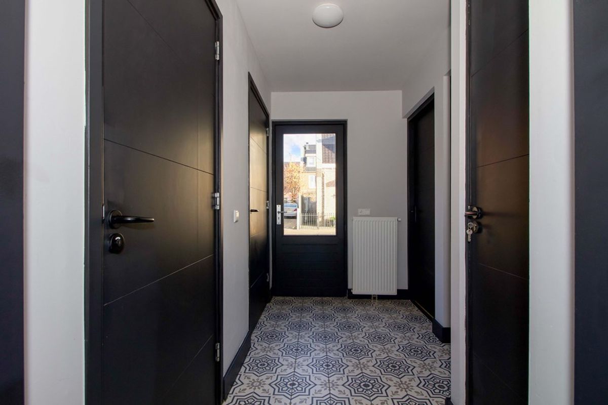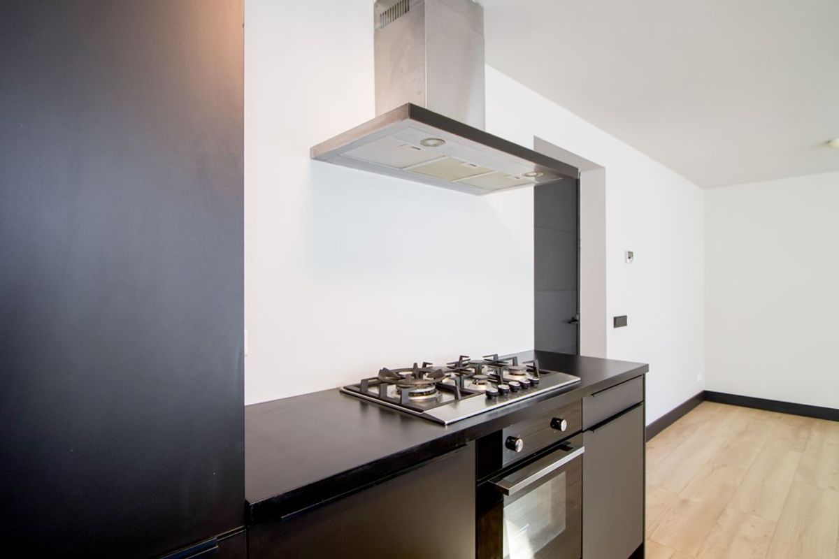 De woonkamer is ruim opgezet en geniet van veel lichtinval dankzij de grote raampartijen aan de voorzijde. De open keuken bevindt zich aan de zijkant van de woonkamer en is voorzien van een modern keukenblok met inbouwapparatuur en voldoende werk- en kastruimte.
