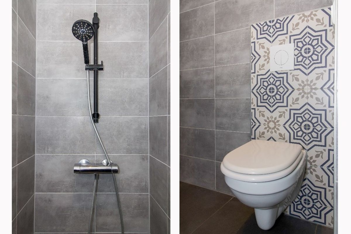 De badkamer is compact maar functioneel ingericht en beschikt over een douche, wastafel en toilet.