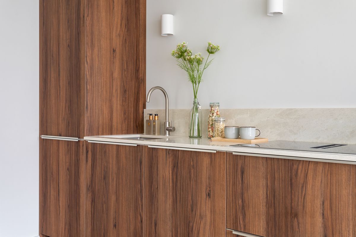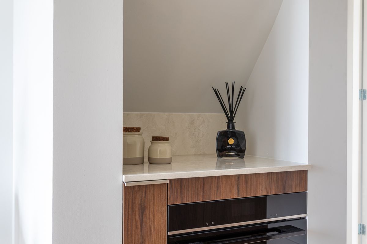 The modern open kitchen is fitted with various built-in appliances. At the front are two bedrooms. Centrally located you will find the neat bathroom with shower and washbasin unit, a separate toilet, and a storage cupboard with space for the central heating boiler.