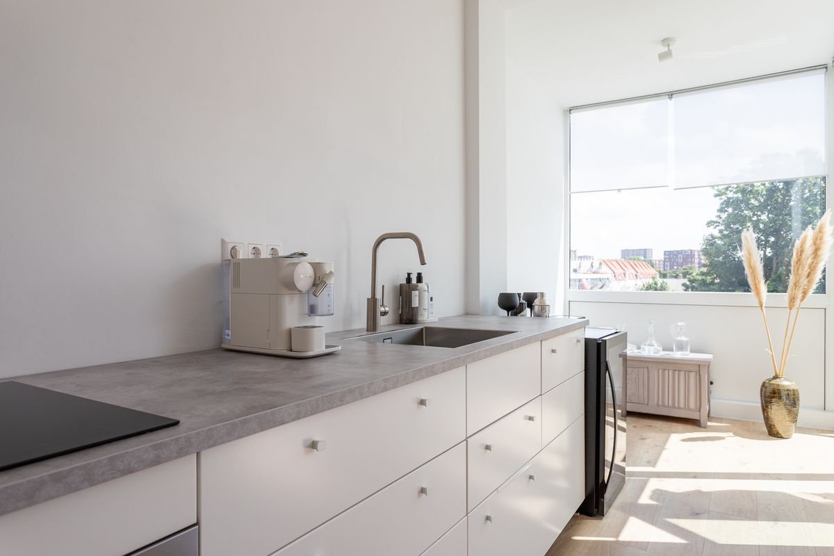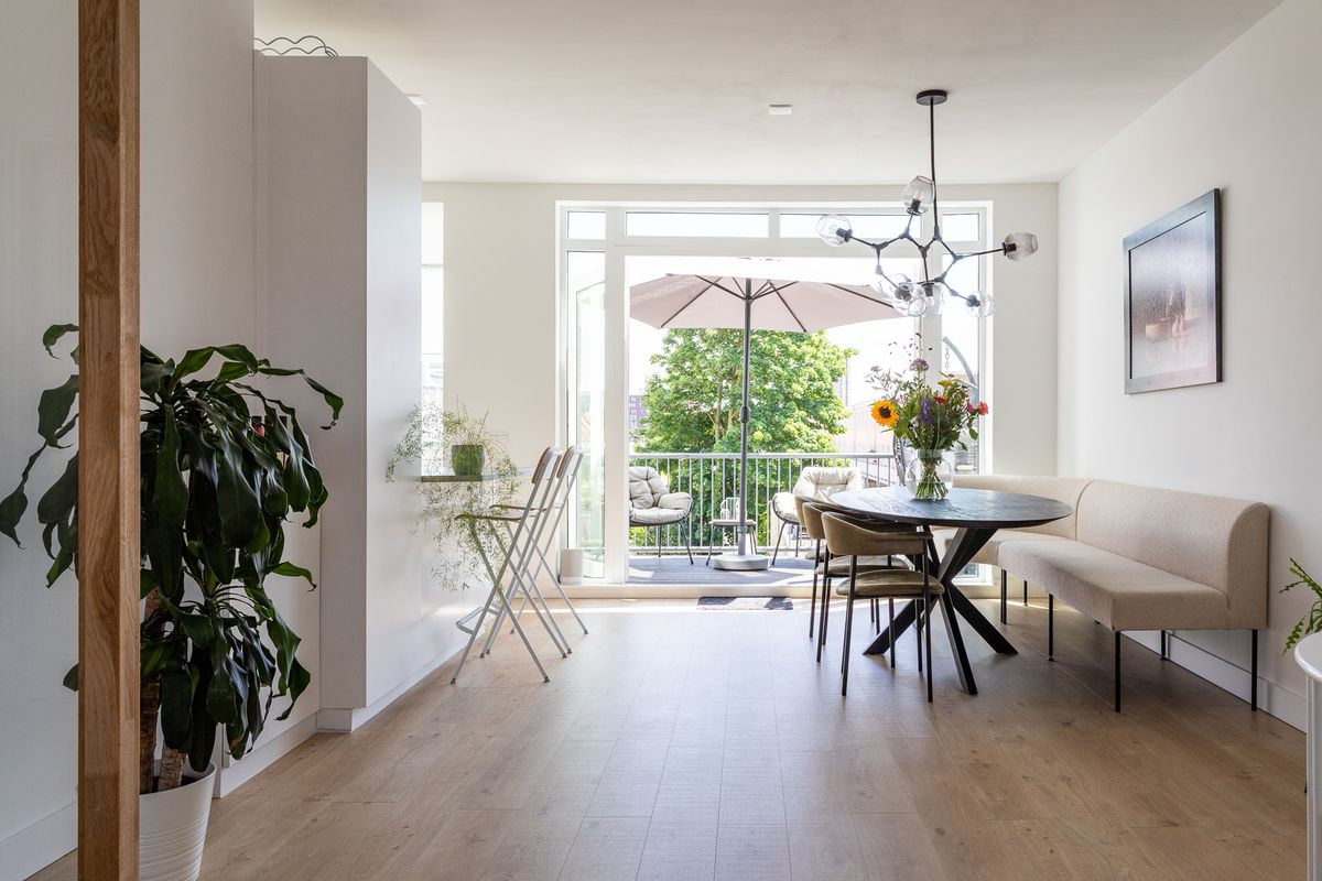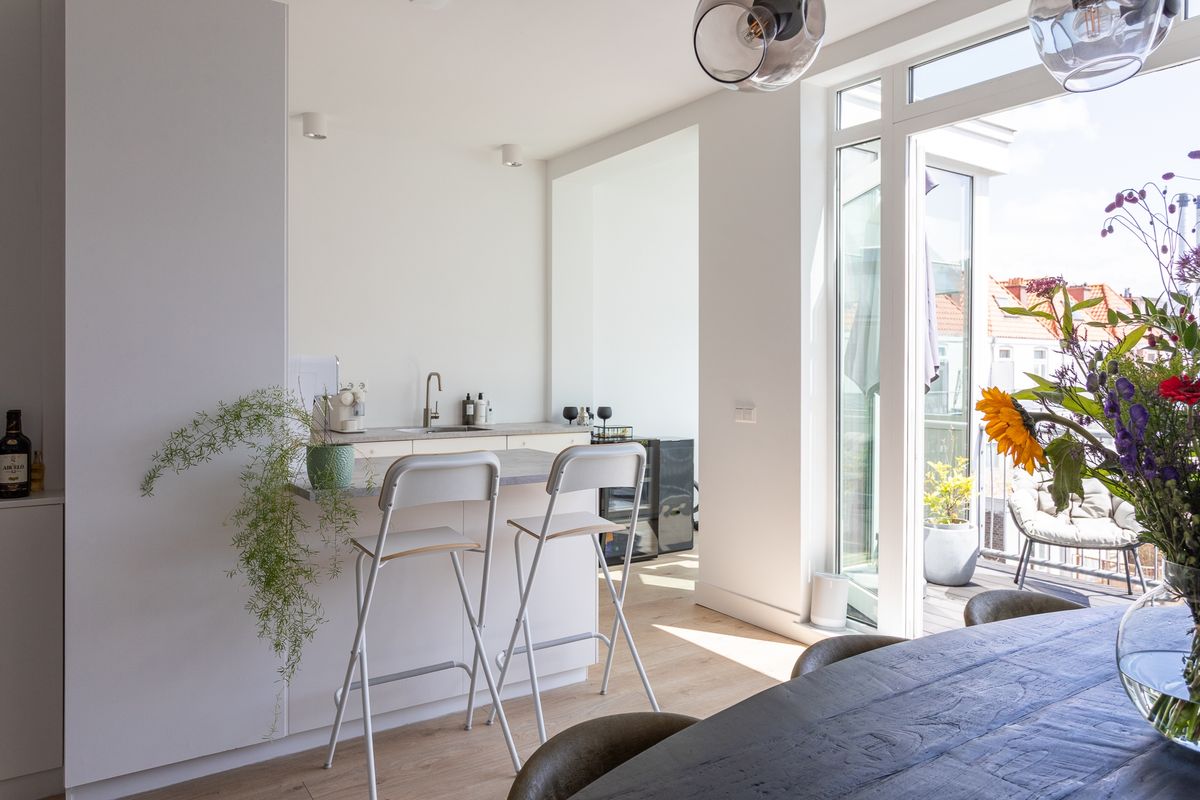 De keuken is strak vormgegeven en uitgerust met hoogwaardige inbouwapparatuur. Via openslaande deuren bereik je het balkon, ideaal voor middag- en avondzon.