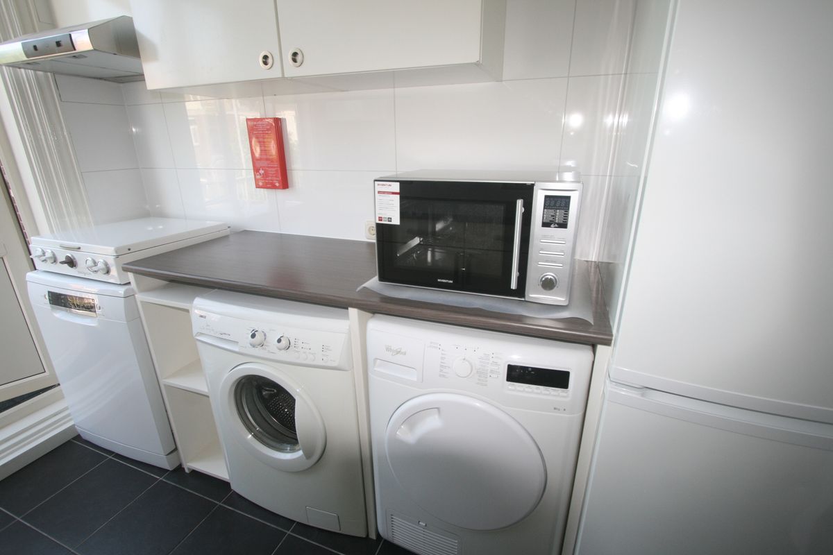 Entree op straatniveau, trap naar de 2e etage, entree van de woning. Riante kamer en suite met prachtige plafonds en heerlijk licht door de grote ramen. De woonkamer heeft toegang tot het dakterras, evenals de keuken. De aparte keuken is uitgerust met koelkast, vriezer, vaatwasser, wasmachine, gasfornuis en combi-oven/magnetron.