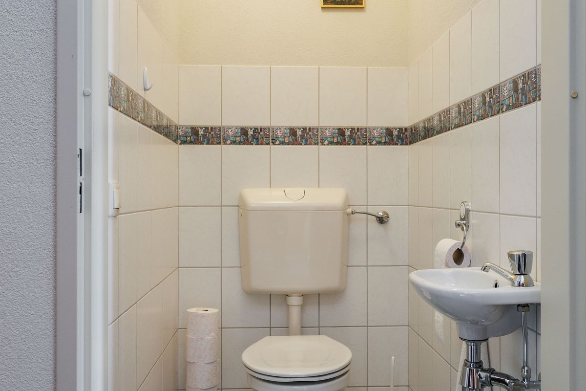 Zodra je de hal/entree binnenstapt, valt meteen op hoeveel licht en ruimte er is. Een meterkast, een nette toiletruimte voorzien van fontein, en natuurlijk de trapopgang naar de verdieping.